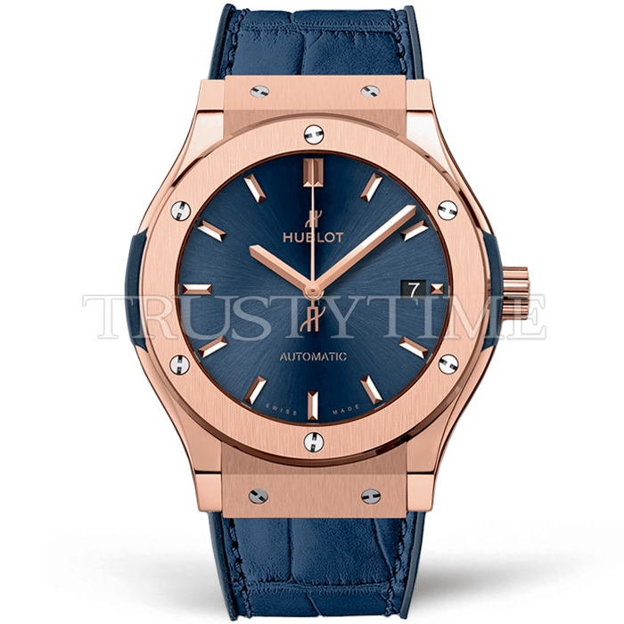 Часы Hublot из коллекции Classic Fusion. Классические мужские часы Hublot Classic Fusion 45 511.OX.7180.LR премиального качества (Артикул магазина: HB-0960) оснащены надежным автоматическим механизмом с автоподзаводом (работает от амплитуды движения руки) калибра HUB1100, в котором реализованы следующие функции: часовая, минутная и секундная стрелки, а так же дата. Круглый корпус часов розового цвета, имеющий размер 45 мм и высоту 9.5 мм превосходно дополнит образ и украсит запястье своего обладателя. Для изготовления часов Hublot Classic Fusion 45 511.OX.7180.LR предлагаемых в нашем интернет-магазине, применяются нержавеющая сталь 316L высокого качества (Швейцарский стандарт), а так же сапфировое стекло высокой прочности, благодаря чему обеспечивается максимальная защита от сколов и механических повреждений. Отличительной чертой данной модели является синий циферблат, часовые индексы которого обеспечивают часовые метки. Завершает образ кожаный ремешок синего цвета с фирменной раскладывающейся застежкой Hublot. Водонепроницаемость данной модели составляет 30М (WR30) – допускается минимальное воздействие с водой.