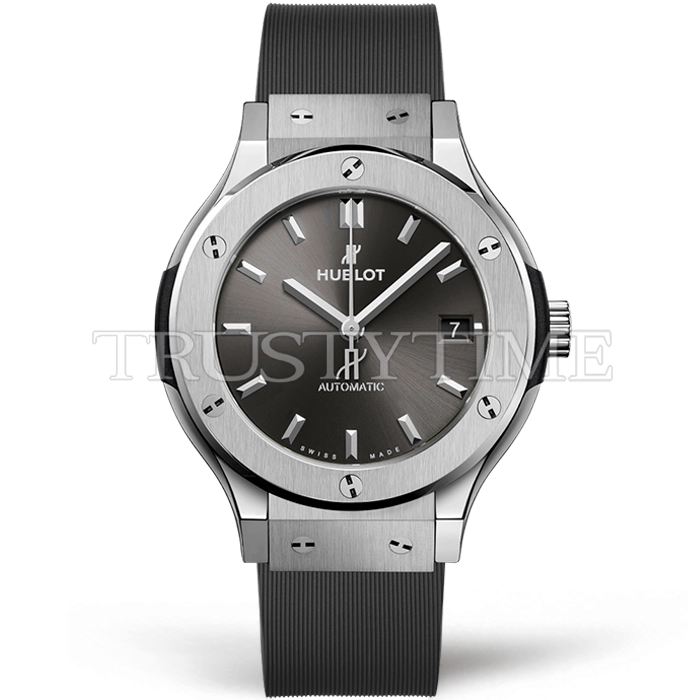 Часы Hublot из коллекции Classic Fusion. Классические женские часы Hublot Classic Fusion 38mm 565.NX.7071.RX.1204 премиального качества (Артикул магазина: HB-1103) оснащены надежным автоматическим механизмом с автоподзаводом (работает от амплитуды движения руки) калибра HUB1100, в котором реализованы следующие функции: часовая, минутная и секундная стрелки, а так же дата. Круглый корпус часов стального цвета, имеющий размер 38 мм и высоту 10 мм превосходно дополнит образ и украсит запястье своего обладателя. Для изготовления часов Hublot Classic Fusion 38mm 565.NX.7071.RX.1204 предлагаемых в нашем интернет-магазине, применяются титан высокого качества (Швейцарский стандарт), а так же сапфировое стекло высокой прочности, благодаря чему обеспечивается максимальная защита от сколов и механических повреждений. Отличительной чертой данной модели является серый циферблат, часовые индексы которого обеспечивают часовые метки. Завершает образ каучуковый ремешок серого цвета с фирменной раскладывающейся застежкой Hublot. Водонепроницаемость данной модели составляет 30М (WR30) – допускается минимальное воздействие с водой.