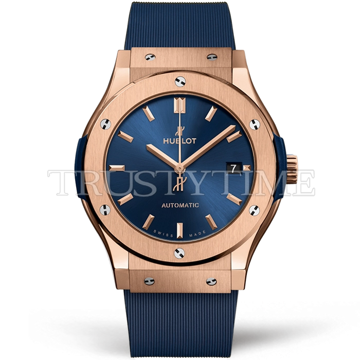 Часы Hublot из коллекции Classic Fusion. Классические мужские часы Hublot Classic Fusion 45mm 511.OX.7180.RX премиального качества (Артикул магазина: HB-1142) оснащены надежным автоматическим механизмом с автоподзаводом (работает от амплитуды движения руки) калибра HUB1100, в котором реализованы следующие функции: часовая, минутная и секундная стрелки, а так же дата. Круглый корпус часов розового цвета, имеющий размер 45 мм и высоту 9.5 мм превосходно дополнит образ и украсит запястье своего обладателя. Для изготовления часов Hublot Classic Fusion 45mm 511.OX.7180.RX предлагаемых в нашем интернет-магазине, применяются нержавеющая сталь 316L высокого качества (Швейцарский стандарт), а так же сапфировое стекло высокой прочности, благодаря чему обеспечивается максимальная защита от сколов и механических повреждений. Отличительной чертой данной модели является синий циферблат, часовые индексы которого обеспечивают часовые метки. Завершает образ каучуковый ремешок синего цвета с фирменной раскладывающейся застежкой Hublot. Водонепроницаемость данной модели составляет 30М (WR30) – допускается минимальное воздействие с водой.