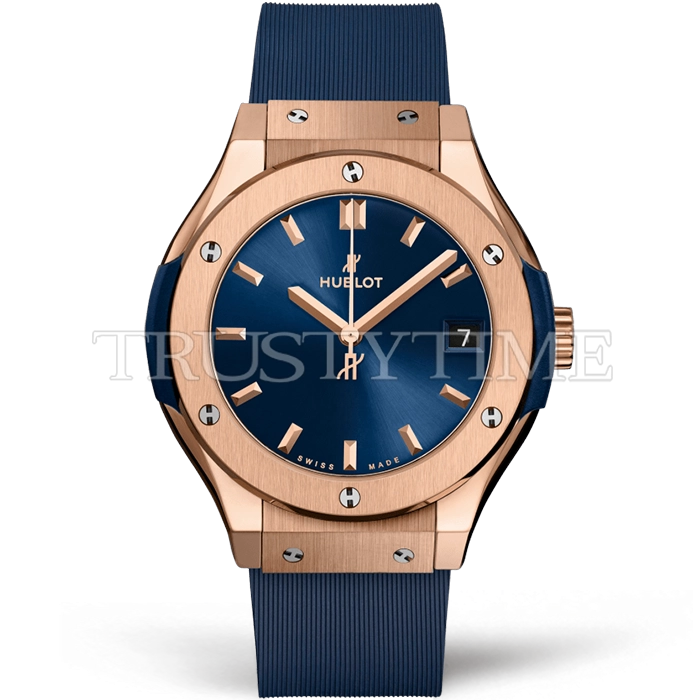 Часы Hublot из коллекции Classic Fusion. Классические женские часы Hublot Classic Fusion 33mm 581.OX.7180.RX премиального качества (Артикул магазина: HB-1212) оснащены надежным кварцевым механизмом (работает от батареи) калибра HUB2912, в котором реализованы следующие функции: часовая, минутная и секундная стрелки, а так же дата. Круглый корпус часов розового цвета, имеющий размер 33 мм и высоту 9 мм превосходно дополнит образ и украсит запястье своего обладателя. Для изготовления часов Hublot Classic Fusion 33mm 581.OX.7180.RX предлагаемых в нашем интернет-магазине, применяются нержавеющая сталь 316F высокого качества (Швейцарский стандарт), а так же сапфировое стекло высокой прочности, благодаря чему обеспечивается максимальная защита от сколов и механических повреждений. Отличительной чертой данной модели является синий циферблат, часовые индексы которого обеспечивают часовые метки. Завершает образ каучуковый ремешок синего цвета с фирменной раскладывающейся застежкой Hublot. Водонепроницаемость данной модели составляет 30М (WR30) – допускается минимальное воздействие с водой.