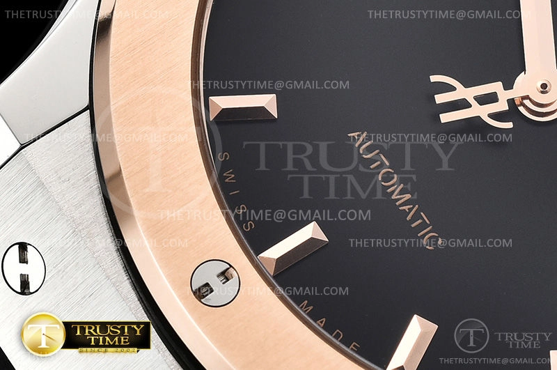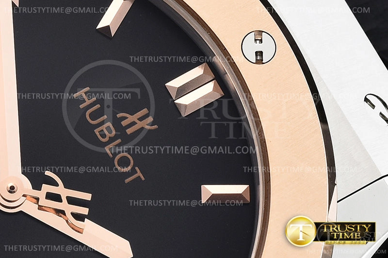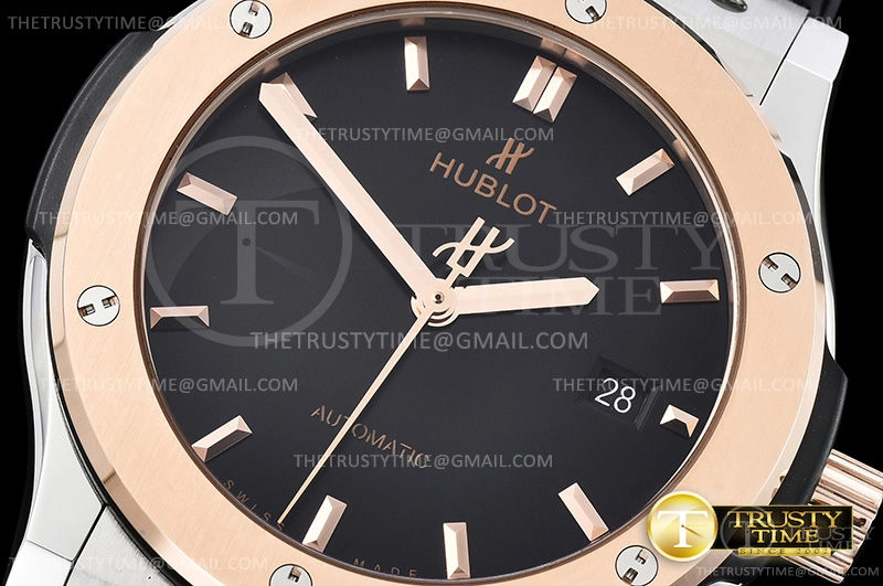 Часы Hublot из коллекции Classic Fusion. Классические мужские часы Hublot Classic Fusion 42mm 542.NO.1181.LR премиального качества (Артикул магазина: HB-0506) оснащены надежным автоматическим механизмом с автоподзаводом (работает от амплитуды движения руки) калибра HUB1100, в котором реализованы следующие функции: часовая, минутная и секундная стрелки, а так же дата. Круглый корпус часов комбинированного сталь с розового золота цвета, имеющий размер 42 мм и высоту 9.5 мм превосходно дополнит образ и украсит запястье своего обладателя. Для изготовления часов Hublot Classic Fusion 42mm 542.NO.1181.LR предлагаемых в нашем интернет-магазине, применяются титан высокого качества (Швейцарский стандарт), а так же сапфировое стекло высокой прочности, благодаря чему обеспечивается максимальная защита от сколов и механических повреждений. Отличительной чертой данной модели является черный циферблат, часовые индексы которого обеспечивают часовые метки. Завершает образ кожаный ремешок черного цвета с фирменной раскладывающейся застежкой Hublot. Водонепроницаемость данной модели составляет 30М (WR30) – допускается минимальное воздействие с водой.