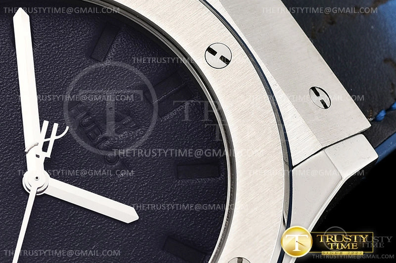 Часы Hublot из коллекции Classic Fusion. Классические мужские часы Hublot Classic Fusion Berluti Scritto 45mm 511.NX.050B.VR.BER16 премиального качества (Артикул магазина: HB-0490) оснащены надежным автоматическим механизмом с автоподзаводом (работает от амплитуды движения руки) калибра ETA2892-2, в котором реализованы следующие функции: часовая, минутная и секундная стрелки, а так же максимально простой функционал без усложнений. Круглый корпус часов стального цвета, имеющий размер 45 мм и высоту 9.5 мм превосходно дополнит образ и украсит запястье своего обладателя. Для изготовления часов Hublot Classic Fusion Berluti Scritto 45mm 511.NX.050B.VR.BER16 предлагаемых в нашем интернет-магазине, применяются титан высокого качества (Швейцарский стандарт), а так же сапфировое стекло высокой прочности, благодаря чему обеспечивается максимальная защита от сколов и механических повреждений. Отличительной чертой данной модели является синий циферблат, часовые индексы которого обеспечивают часовые метки. Завершает образ кожаный ремешок синего цвета с фирменной раскладывающейся застежкой Hublot. Водонепроницаемость данной модели составляет 30М (WR30) – допускается минимальное воздействие с водой.