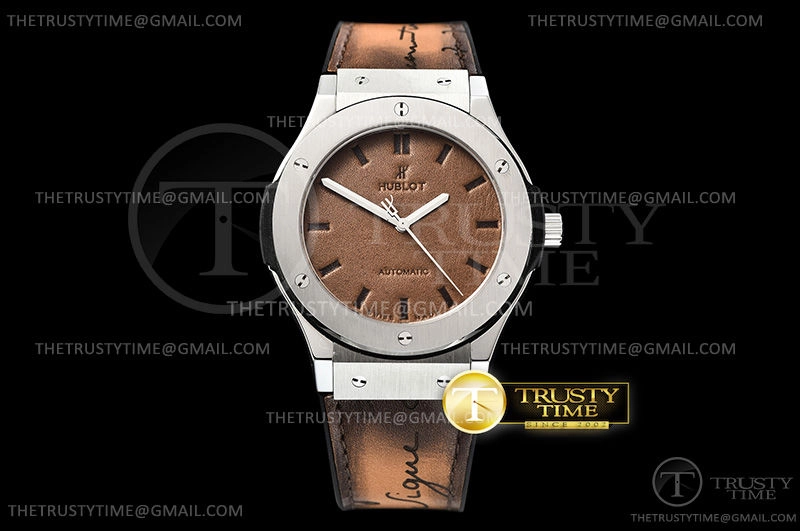 Часы Hublot из коллекции Classic Fusion. Классические мужские часы Hublot Classic Fusion Berluti Scritto Platinium 45mm 511.TX.050T.VR.BER16 премиального качества (Артикул магазина: HB-0489) оснащены надежным автоматическим механизмом с автоподзаводом (работает от амплитуды движения руки) калибра ETA2892-2, в котором реализованы следующие функции: часовая, минутная и секундная стрелки, а так же максимально простой функционал без усложнений. Круглый корпус часов стального цвета, имеющий размер 45 мм и высоту 9.5 мм превосходно дополнит образ и украсит запястье своего обладателя. Для изготовления часов Hublot Classic Fusion Berluti Scritto Platinium 45mm 511.TX.050T.VR.BER16 предлагаемых в нашем интернет-магазине, применяются титан высокого качества (Швейцарский стандарт), а так же сапфировое стекло высокой прочности, благодаря чему обеспечивается максимальная защита от сколов и механических повреждений. Отличительной чертой данной модели является коричневый циферблат, часовые индексы которого обеспечивают часовые метки. Завершает образ кожаный ремешок коричневого цвета с фирменной раскладывающейся застежкой Hublot. Водонепроницаемость данной модели составляет 30М (WR30) – допускается минимальное воздействие с водой.