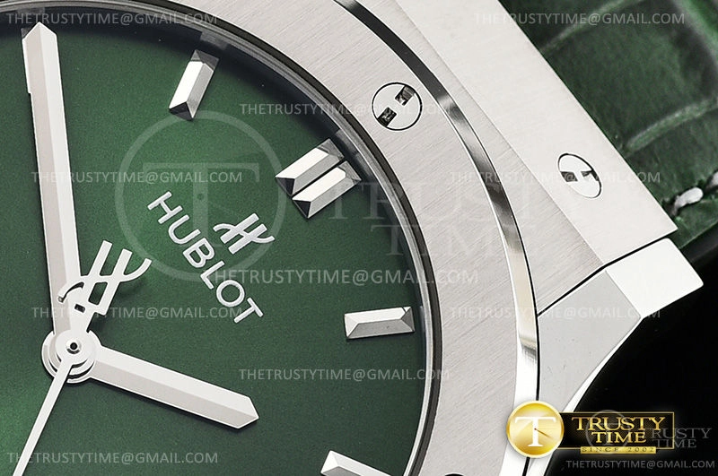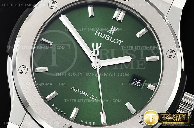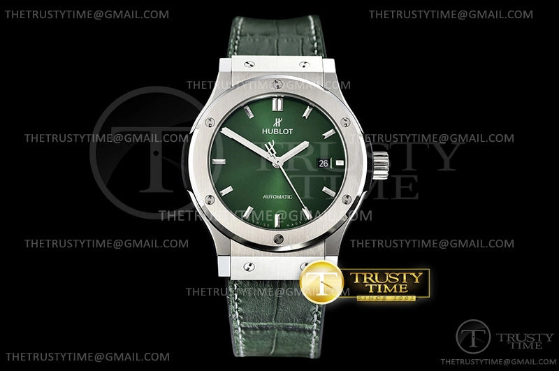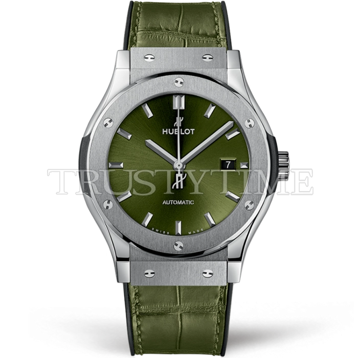 Часы Hublot из коллекции Classic Fusion. Классические мужские часы Hublot Classic Fusion 42mm 542.NX.8970.LR премиального качества (Артикул магазина: HB-0488) оснащены надежным автоматическим механизмом с автоподзаводом (работает от амплитуды движения руки) калибра HUB1100, в котором реализованы следующие функции: часовая, минутная и секундная стрелки, а так же дата. Круглый корпус часов стального цвета, имеющий размер 42 мм и высоту 9.5 мм превосходно дополнит образ и украсит запястье своего обладателя. Для изготовления часов Hublot Classic Fusion 42mm 542.NX.8970.LR предлагаемых в нашем интернет-магазине, применяются титан высокого качества (Швейцарский стандарт), а так же сапфировое стекло высокой прочности, благодаря чему обеспечивается максимальная защита от сколов и механических повреждений. Отличительной чертой данной модели является зеленый циферблат, часовые индексы которого обеспечивают часовые метки. Завершает образ кожаный ремешок зеленого цвета с фирменной раскладывающейся застежкой Hublot. Водонепроницаемость данной модели составляет 30М (WR30) – допускается минимальное воздействие с водой.