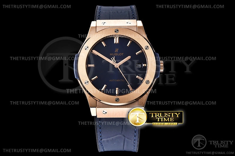Часы Hublot из коллекции Classic Fusion. Классические мужские часы Hublot Classic Fusion 45mm 511.OX.7180.LR премиального качества (Артикул магазина: HB-0476) оснащены надежным автоматическим механизмом с автоподзаводом (работает от амплитуды движения руки) калибра HUB1100, в котором реализованы следующие функции: часовая, минутная и секундная стрелки, а так же дата. Круглый корпус часов розового цвета, имеющий размер 45 мм и высоту 9.5 мм превосходно дополнит образ и украсит запястье своего обладателя. Для изготовления часов Hublot Classic Fusion 45mm 511.OX.7180.LR предлагаемых в нашем интернет-магазине, применяются нержавеющая сталь 316L высокого качества (Швейцарский стандарт), а так же сапфировое стекло высокой прочности, благодаря чему обеспечивается максимальная защита от сколов и механических повреждений. Отличительной чертой данной модели является синий циферблат, часовые индексы которого обеспечивают часовые метки. Завершает образ кожаный ремешок синего цвета с фирменной раскладывающейся застежкой Hublot. Водонепроницаемость данной модели составляет 30М (WR30) – допускается минимальное воздействие с водой.