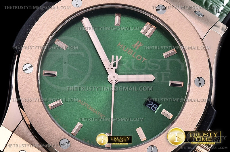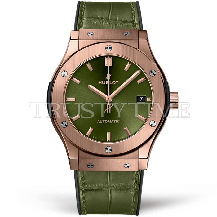 Часы Hublot из коллекции Classic Fusion. Классические мужские часы Hublot Classic Fusion 45mm 511.OX.8980.LR премиального качества (Артикул магазина: HB-0574) оснащены надежным автоматическим механизмом с автоподзаводом (работает от амплитуды движения руки) калибра HUB1112, в котором реализованы следующие функции: часовая, минутная и секундная стрелки, а так же дата. Круглый корпус часов розового цвета, имеющий размер 45 мм и высоту 9.5 мм превосходно дополнит образ и украсит запястье своего обладателя. Для изготовления часов Hublot Classic Fusion 45mm 511.OX.8980.LR предлагаемых в нашем интернет-магазине, применяются нержавеющая сталь 316L высокого качества (Швейцарский стандарт), а так же сапфировое стекло высокой прочности, благодаря чему обеспечивается максимальная защита от сколов и механических повреждений. Отличительной чертой данной модели является зеленый циферблат, часовые индексы которого обеспечивают часовые метки. Завершает образ кожаный ремешок зеленого цвета с фирменной раскладывающейся застежкой Hublot. Водонепроницаемость данной модели составляет 30М (WR30) – допускается минимальное воздействие с водой.