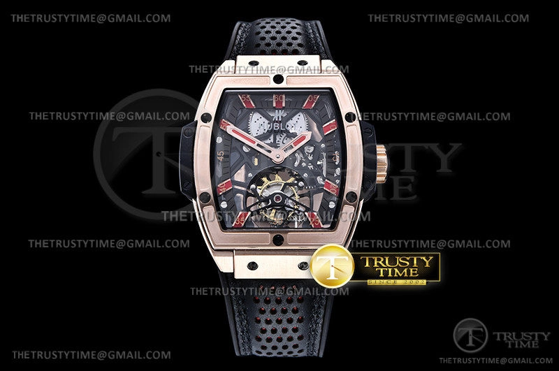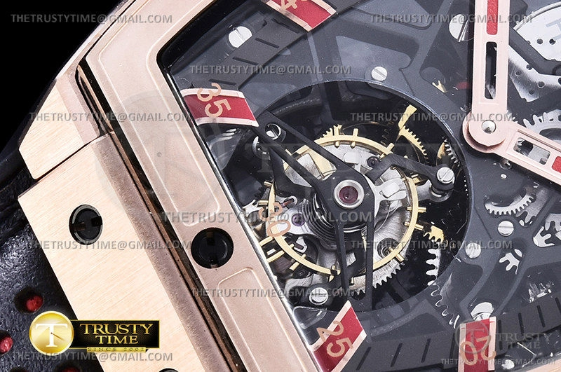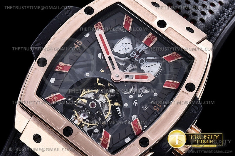 Часы Hublot из коллекции Spirit Of Big Bang. Спортивные мужские часы Hublot Masterpiece Mp 06 Senna King Gold 906.OX.0123.VR.AES13 премиального качества (Артикул магазина: HB-0557) оснащены надежным автоматическим механизмом с ручным заводом калибра Seagull Handwind Tourbillon, в котором реализованы следующие функции: часова и минутка стрелки, а так же турбийон. Бочкообразный корпус часов розового цвета, имеющий размер 42 мм и высоту 16.5 мм превосходно дополнит образ и украсит запястье своего обладателя. Для изготовления часов Hublot Masterpiece Mp 06 Senna King Gold 906.OX.0123.VR.AES13 предлагаемых в нашем интернет-магазине, применяются нержавеющая сталь 316L высокого качества (Швейцарский стандарт), а так же сапфировое стекло высокой прочности, благодаря чему обеспечивается максимальная защита от сколов и механических повреждений. Отличительной чертой данной модели является скелетонизированный циферблат, часовые индексы которого обеспечивают часовые метки. Завершает образ кожаный ремешок черного цвета с фирменной раскладывающейся застежкой Hublot. Водонепроницаемость данной модели составляет 30М (WR30) – допускается минимальное воздействие с водой.