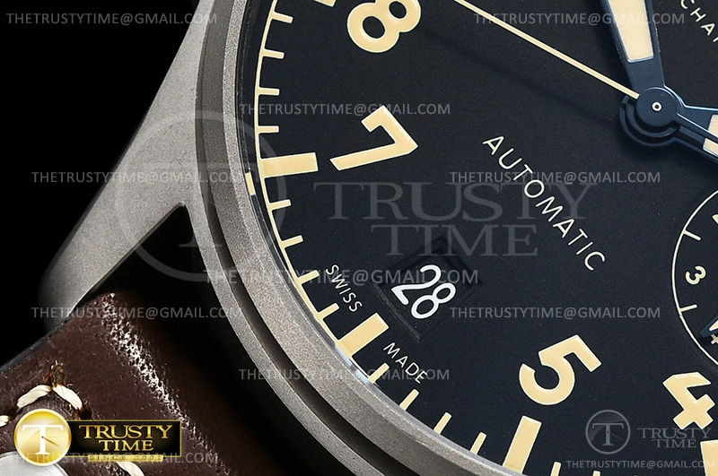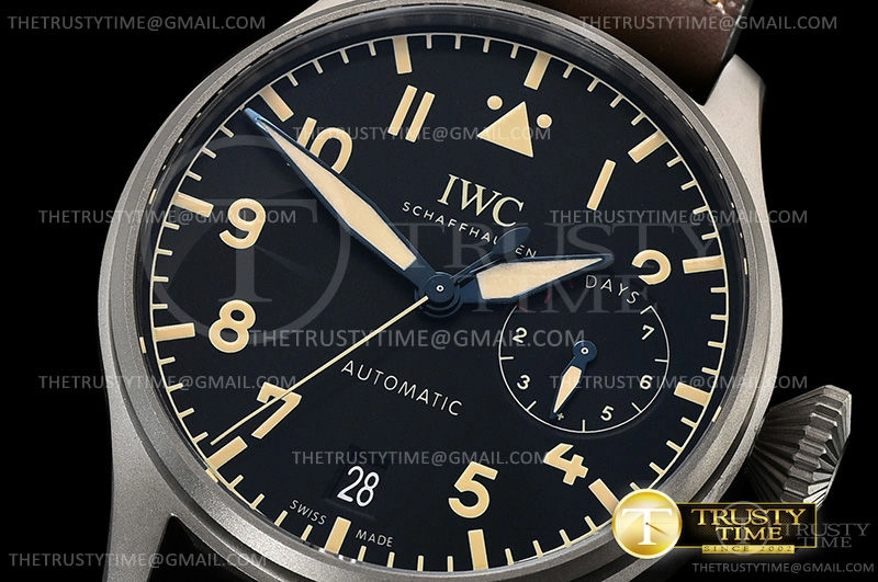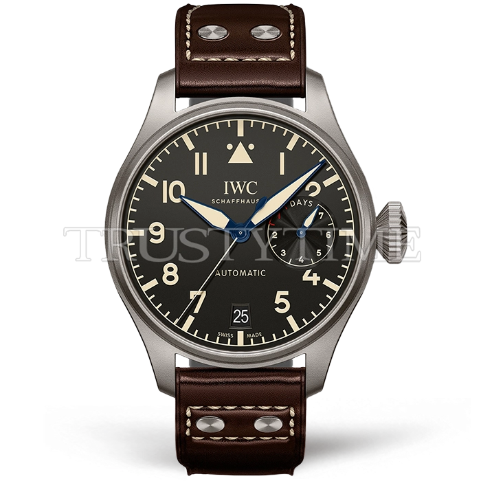 Часы IWC из коллекции Big Pilot's. Классические мужские часы IWC Pilot's Watch Heritage 46mm IW501004 премиального качества (Артикул магазина: IW-0461) оснащены надежным автоматическим механизмом с автоподзаводом (работает от амплитуды движения руки) калибра IWC52110, в котором реализованы следующие функции: часовая, минутная и секундная стрелки, а так же резерв хода, дата. Круглый корпус часов серого цвета, имеющий размер 46 мм и высоту 15.5 мм превосходно дополнит образ и украсит запястье своего обладателя. Для изготовления часов IWC Pilot's Watch Heritage 46mm IW501004 предлагаемых в нашем интернет-магазине, применяются титан высокого качества (Швейцарский стандарт), а так же сапфировое стекло высокой прочности, благодаря чему обеспечивается максимальная защита от сколов и механических повреждений. Отличительной чертой данной модели является черный циферблат, часовые индексы которого обеспечивают арабские цифры. Завершает образ кожаный ремешок коричневого цвета с фирменной раскладывающейся застежкой IWC. Водонепроницаемость данной модели составляет 30М (WR30) – допускается минимальное воздействие с водой.
