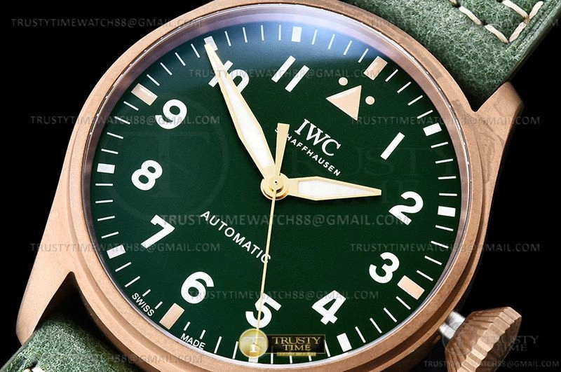 Часы IWC из коллекции Big Pilot's. Классические мужские часы IWC Big Pilot's Watch Spitfire 43mm IW329702 премиального качества (Артикул магазина: IW-0776) оснащены надежным автоматическим механизмом с автоподзаводом (работает от амплитуды движения руки) калибра ETA2824-2, в котором реализованы следующие функции: часовая, минутная и секундная стрелки, а так же максимально простой функционал без усложнений. Круглый корпус часов бронзового цвета, имеющий размер 43 мм и высоту 14 мм превосходно дополнит образ и украсит запястье своего обладателя. Для изготовления часов IWC Big Pilot's Watch Spitfire 43mm IW329702 предлагаемых в нашем интернет-магазине, применяются бронза высокого качества (Швейцарский стандарт), а так же сапфировое стекло высокой прочности, благодаря чему обеспечивается максимальная защита от сколов и механических повреждений. Отличительной чертой данной модели является зеленый циферблат, часовые индексы которого обеспечивают арабские цифры. Завершает образ кожаный ремешок зеленого цвета с фирменной классической застежкой IWC. Водонепроницаемость данной модели составляет 30М (WR30) – допускается минимальное воздействие с водой.