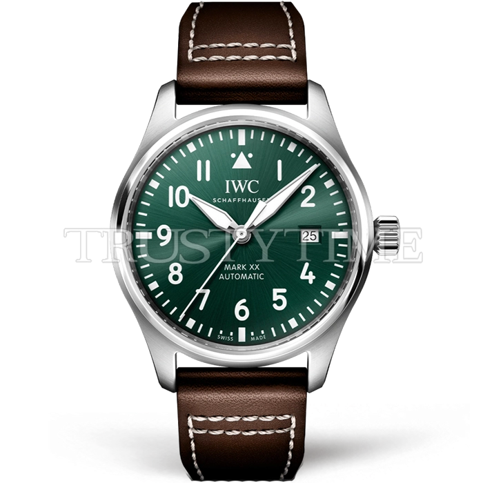 Часы IWC из коллекции Pilot's. Классические мужские часы IWC Pilot's Watch Mark XX 40mm IW328205 премиального качества (Артикул магазина: IW-0889) оснащены надежным автоматическим механизмом с автоподзаводом (работает от амплитуды движения руки) калибра MY9015, в котором реализованы следующие функции: часовая, минутная и секундная стрелки, а так же дата. Круглый корпус часов стального цвета, имеющий размер 40 мм и высоту 11.5 мм превосходно дополнит образ и украсит запястье своего обладателя. Для изготовления часов IWC Pilot's Watch Mark XX 40mm IW328205 предлагаемых в нашем интернет-магазине, применяются нержавеющая сталь 316L высокого качества (Швейцарский стандарт), а так же сапфировое стекло высокой прочности, благодаря чему обеспечивается максимальная защита от сколов и механических повреждений. Отличительной чертой данной модели является зеленый циферблат, часовые индексы которого обеспечивают арабские цифры. Завершает образ кожаный ремешок коричневого цвета с фирменной классической застежкой IWC. Водонепроницаемость данной модели составляет 30М (WR30) – допускается минимальное воздействие с водой.