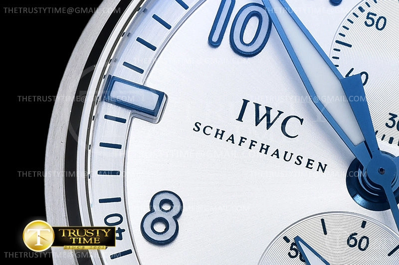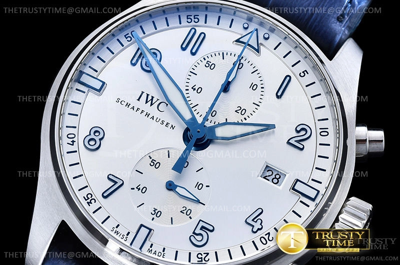 Часы IWC из коллекции Pilot's Chronograph. Спортивные мужские часы IWC Pilot’s Watch Chronograph Spitfire Edition «BFI London Film Festival» 43mm IW387812 премиального качества (Артикул магазина: IW-0545) оснащены надежным автоматическим механизмом с автоподзаводом (работает от амплитуды движения руки) калибра Valjoux-7750, в котором реализованы следующие функции: часовая, минутная и секундная стрелки, а так же хронограф, дата. Круглый корпус часов стального цвета, имеющий размер 43 мм и высоту 15 мм превосходно дополнит образ и украсит запястье своего обладателя. Для изготовления часов IWC Pilot’s Watch Chronograph Spitfire Edition «BFI London Film Festival» 43mm IW387812 предлагаемых в нашем интернет-магазине, применяются нержавеющая сталь 316F высокого качества (Швейцарский стандарт), а так же сапфировое стекло высокой прочности, благодаря чему обеспечивается максимальная защита от сколов и механических повреждений. Отличительной чертой данной модели является серебристый циферблат, часовые индексы которого обеспечивают арабские цифры. Завершает образ кожаный ремешок синего цвета с фирменной раскладывающейся застежкой IWC. Водонепроницаемость данной модели составляет 30М (WR30) – допускается минимальное воздействие с водой.