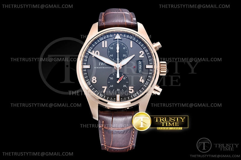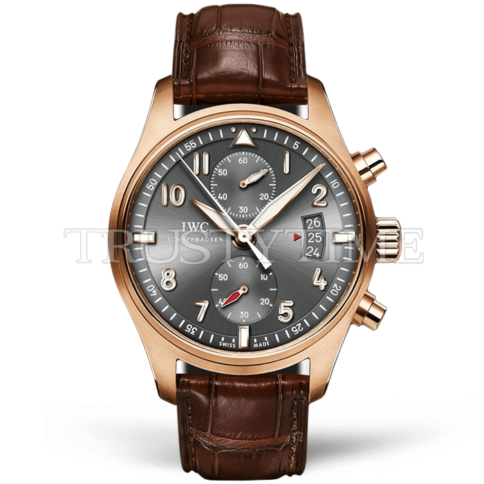 Часы IWC из коллекции Pilot's Chronograph. Спортивные мужские часы IWC Pilot's Watch Spitfire Chronograph 43mm IW387803 премиального качества (Артикул магазина: IW-0544) оснащены надежным автоматическим механизмом с автоподзаводом (работает от амплитуды движения руки) калибра Valjoux-7750, в котором реализованы следующие функции: часовая, минутная и секундная стрелки, а так же хронограф, дата. Круглый корпус часов розового цвета, имеющий размер 43 мм и высоту 16 мм превосходно дополнит образ и украсит запястье своего обладателя. Для изготовления часов IWC Pilot's Watch Spitfire Chronograph 43mm IW387803 предлагаемых в нашем интернет-магазине, применяются нержавеющая сталь 316F высокого качества (Швейцарский стандарт), а так же сапфировое стекло высокой прочности, благодаря чему обеспечивается максимальная защита от сколов и механических повреждений. Отличительной чертой данной модели является серый циферблат, часовые индексы которого обеспечивают арабские цифры. Завершает образ кожаный ремешок коричневого цвета с фирменной раскладывающейся застежкой IWC. Водонепроницаемость данной модели составляет 30М (WR30) – допускается минимальное воздействие с водой.