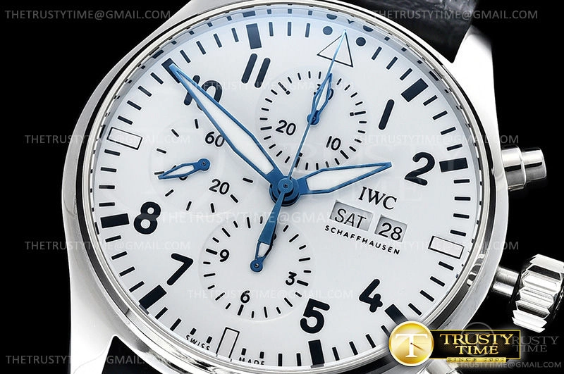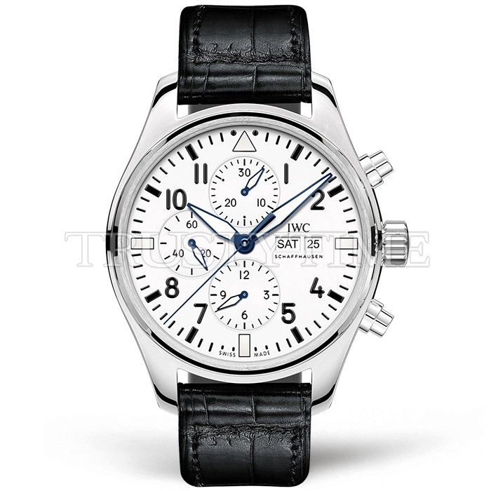 Часы IWC из коллекции Pilot's Chronograph. Спортивные мужские часы IWC Pilot's Watch Chronograph Edition 150 Years 43mm IW377725 премиального качества (Артикул магазина: IW-0541) оснащены надежным автоматическим механизмом с автоподзаводом (работает от амплитуды движения руки) калибра Valjoux-7750, в котором реализованы следующие функции: часовая, минутная и секундная стрелки, а так же хронограф, дата, день недели. Круглый корпус часов стального цвета, имеющий размер 43 мм и высоту 15 мм превосходно дополнит образ и украсит запястье своего обладателя. Для изготовления часов IWC Pilot's Watch Chronograph Edition 150 Years 43mm IW377725 предлагаемых в нашем интернет-магазине, применяются нержавеющая сталь 316F высокого качества (Швейцарский стандарт), а так же сапфировое стекло высокой прочности, благодаря чему обеспечивается максимальная защита от сколов и механических повреждений. Отличительной чертой данной модели является белый циферблат, часовые индексы которого обеспечивают арабские цифры. Завершает образ кожаный ремешок черного цвета с фирменной классической застежкой IWC. Водонепроницаемость данной модели составляет 30М (WR30) – допускается минимальное воздействие с водой.