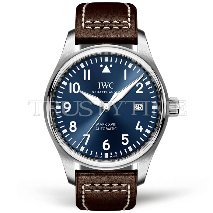 Часы IWC из коллекции Mark XVIII. Классические мужские часы IWC Pilot's Watch Mark XVIII Edition le Petit Prince 40mm IW327004 премиального качества (Артикул магазина: IW-0515) оснащены надежным автоматическим механизмом с автоподзаводом (работает от амплитуды движения руки) калибра ETA2892, в котором реализованы следующие функции: часовая, минутная и секундная стрелки, а так же дата. Круглый корпус часов стального цвета, имеющий размер 40 мм и высоту 10 мм превосходно дополнит образ и украсит запястье своего обладателя. Для изготовления часов IWC Pilot's Watch Mark XVIII Edition le Petit Prince 40mm IW327004 предлагаемых в нашем интернет-магазине, применяются нержавеющая сталь 316L высокого качества (Швейцарский стандарт), а так же сапфировое стекло высокой прочности, благодаря чему обеспечивается максимальная защита от сколов и механических повреждений. Отличительной чертой данной модели является синий циферблат, часовые индексы которого обеспечивают арабские цифры. Завершает образ кожаный ремешок коричневого цвета с фирменной классической застежкой IWC. Водонепроницаемость данной модели составляет 30М (WR30) – допускается минимальное воздействие с водой.