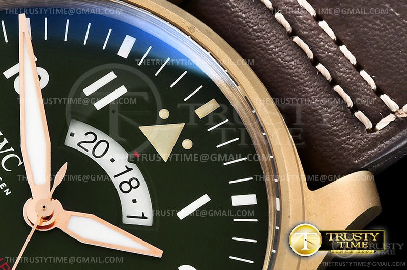 Часы IWC из коллекции Pilot's. Классические мужские часы IWC Pilot's Watch UTC Spitfire Edition MJ271 41mm IW327101 премиального качества (Артикул магазина: IW-0529) оснащены надежным автоматическим механизмом с автоподзаводом (работает от амплитуды движения руки) калибра ETA2836-2, в котором реализованы следующие функции: часовая, минутная и секундная стрелки, а так же дата. Круглый корпус часов бронзового цвета, имеющий размер 41 мм и высоту 14.1 мм превосходно дополнит образ и украсит запястье своего обладателя. Для изготовления часов IWC Pilot's Watch UTC Spitfire Edition MJ271 41mm IW327101 предлагаемых в нашем интернет-магазине, применяются бронза высокого качества (Швейцарский стандарт), а так же сапфировое стекло высокой прочности, благодаря чему обеспечивается максимальная защита от сколов и механических повреждений. Отличительной чертой данной модели является зеленый циферблат, часовые индексы которого обеспечивают арабские цифры. Завершает образ кожаный ремешок коричневого цвета с фирменной классической застежкой IWC. Водонепроницаемость данной модели составляет 30М (WR30) – допускается минимальное воздействие с водой.