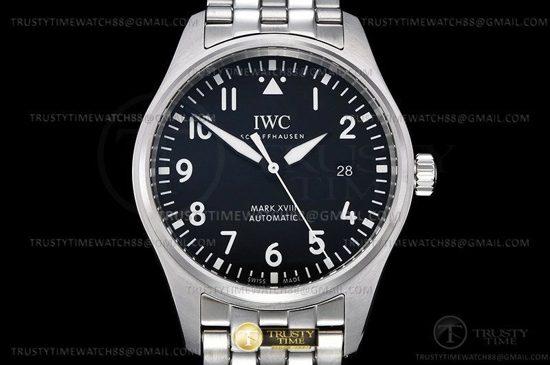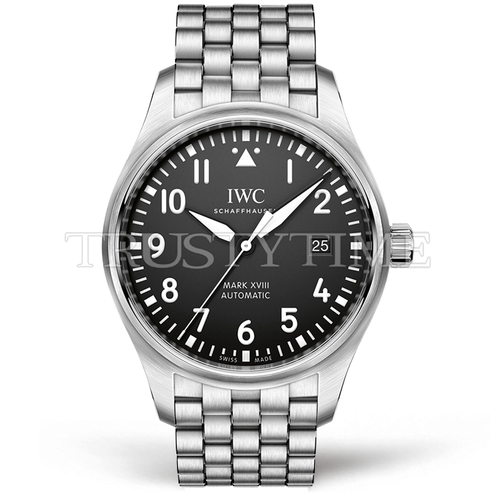 Часы IWC из коллекции Mark XVIII. Классические мужские часы IWC Pilot's Watch Mark XVIII 40mm IW327011 премиального качества (Артикул магазина: IW-0771) оснащены надежным автоматическим механизмом с автоподзаводом (работает от амплитуды движения руки) калибра IWC35111, в котором реализованы следующие функции: часовая, минутная и секундная стрелки, а так же дата. Круглый корпус часов стального цвета, имеющий размер 40 мм и высоту 10 мм превосходно дополнит образ и украсит запястье своего обладателя. Для изготовления часов IWC Pilot's Watch Mark XVIII 40mm IW327011 предлагаемых в нашем интернет-магазине, применяются нержавеющая сталь 316F высокого качества (Швейцарский стандарт), а так же сапфировое стекло высокой прочности, благодаря чему обеспечивается максимальная защита от сколов и механических повреждений. Отличительной чертой данной модели является черный циферблат, часовые индексы которого обеспечивают арабские цифры. Завершает образ браслет из нержавеющей стали стального цвета с фирменной раскладывающейся застежкой IWC. Водонепроницаемость данной модели составляет 30М (WR30) – допускается минимальное воздействие с водой.