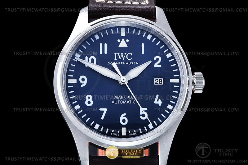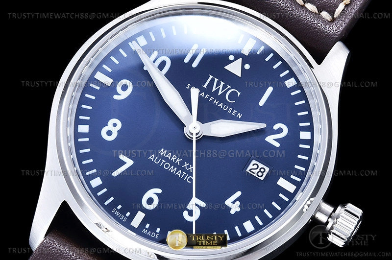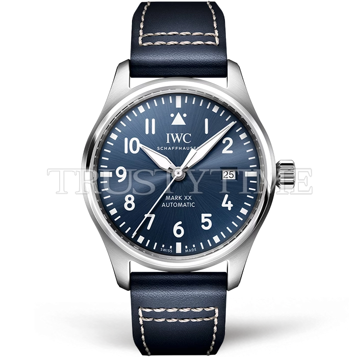 Часы IWC из коллекции Pilot's. Классические мужские часы IWC Pilot’s Watch Mark XX 40mm IW328203 премиального качества (Артикул магазина: IW-0885) оснащены надежным автоматическим механизмом с автоподзаводом (работает от амплитуды движения руки) калибра MY9015, в котором реализованы следующие функции: часовая, минутная и секундная стрелки, а так же дата. Круглый корпус часов стального цвета, имеющий размер 40 мм и высоту 11.5 мм превосходно дополнит образ и украсит запястье своего обладателя. Для изготовления часов IWC Pilot’s Watch Mark XX 40mm IW328203 предлагаемых в нашем интернет-магазине, применяются нержавеющая сталь 316L высокого качества (Швейцарский стандарт), а так же сапфировое стекло высокой прочности, благодаря чему обеспечивается максимальная защита от сколов и механических повреждений. Отличительной чертой данной модели является синий циферблат, часовые индексы которого обеспечивают арабские цифры. Завершает образ кожаный ремешок синего цвета с фирменной классической застежкой IWC. Водонепроницаемость данной модели составляет 30М (WR30) – допускается минимальное воздействие с водой.