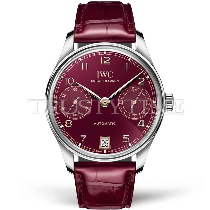 Часы IWC из коллекции Portugieser. Классические мужские часы IWC Portugieser Automatic Year of the Horse 42mm IW501709 премиального качества (Артикул магазина: IW-0938) оснащены надежным автоматическим механизмом с автоподзаводом (работает от амплитуды движения руки) калибра IWC52011, в котором реализованы следующие функции: часовая, минутная и секундная стрелки, а так же резерв хода, дата. Круглый корпус часов стального цвета, имеющий размер 42 мм и высоту 13 мм превосходно дополнит образ и украсит запястье своего обладателя. Для изготовления часов IWC Portugieser Automatic Year of the Horse 42mm IW501709 предлагаемых в нашем интернет-магазине, применяются нержавеющая сталь 316L высокого качества (Швейцарский стандарт), а так же сапфировое стекло высокой прочности, благодаря чему обеспечивается максимальная защита от сколов и механических повреждений. Отличительной чертой данной модели является бордовый циферблат, часовые индексы которого обеспечивают арабские цифры. Завершает образ кожаный ремешок бордового цвета с фирменной раскладывающейся застежкой IWC. Водонепроницаемость данной модели составляет 30М (WR30) – допускается минимальное воздействие с водой.