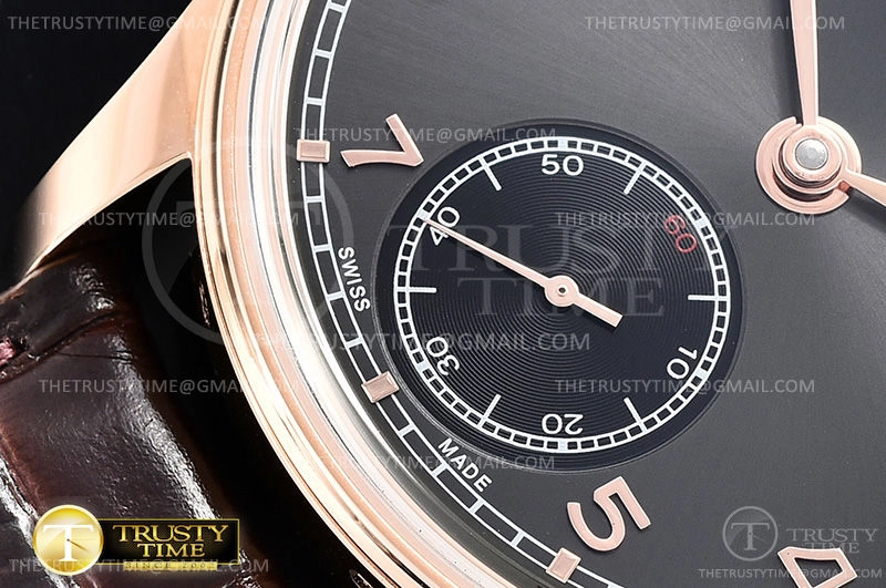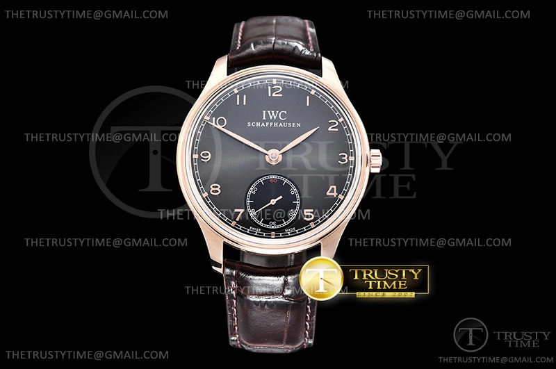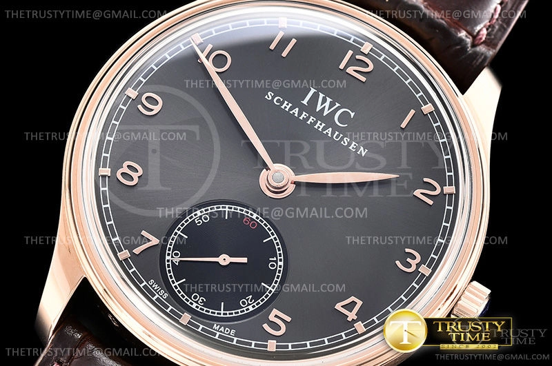 Часы IWC из коллекции Portugieser. Классические мужские часы IWC Portugieser Hand-wound 44mm IW545406 премиального качества (Артикул магазина: IW-0652) оснащены надежным автоматическим механизмом с автоподзаводом (работает от амплитуды движения руки) калибра IWC98295, в котором реализованы следующие функции: часовая, минутная и секундная стрелки, а так же максимально простой функционал без усложнений. Круглый корпус часов розового цвета, имеющий размер 44 мм и высоту 10 мм превосходно дополнит образ и украсит запястье своего обладателя. Для изготовления часов IWC Portugieser Hand-wound 44mm IW545406 предлагаемых в нашем интернет-магазине, применяются нержавеющая сталь 316L высокого качества (Швейцарский стандарт), а так же сапфировое стекло высокой прочности, благодаря чему обеспечивается максимальная защита от сколов и механических повреждений. Отличительной чертой данной модели является серый циферблат, часовые индексы которого обеспечивают арабские цифры. Завершает образ кожаный ремешок черного цвета с фирменной классической застежкой IWC. Водонепроницаемость данной модели составляет 30М (WR30) – допускается минимальное воздействие с водой.
