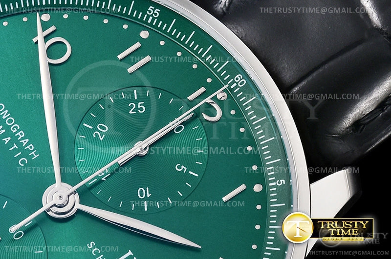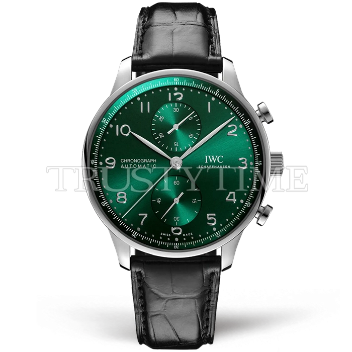 Часы IWC из коллекции Portugieser Chronograph. Спортивные мужские часы IWC Portugieser Chronograph 41mm IW371615 премиального качества (Артикул магазина: IW-0737) оснащены надежным автоматическим механизмом с автоподзаводом (работает от амплитуды движения руки) калибра Valjoux-7750, в котором реализованы следующие функции: часовая, минутная и секундная стрелки, а так же хронограф. Круглый корпус часов стального цвета, имеющий размер 41 мм и высоту 13 мм превосходно дополнит образ и украсит запястье своего обладателя. Для изготовления часов IWC Portugieser Chronograph 41mm IW371615 предлагаемых в нашем интернет-магазине, применяются нержавеющая сталь 316L высокого качества (Швейцарский стандарт), а так же сапфировое стекло высокой прочности, благодаря чему обеспечивается максимальная защита от сколов и механических повреждений. Отличительной чертой данной модели является зеленый циферблат, часовые индексы которого обеспечивают арабские цифры. Завершает образ кожаный ремешок черного цвета с фирменной раскладывающейся застежкой IWC. Водонепроницаемость данной модели составляет 30М (WR30) – допускается минимальное воздействие с водой.