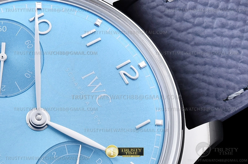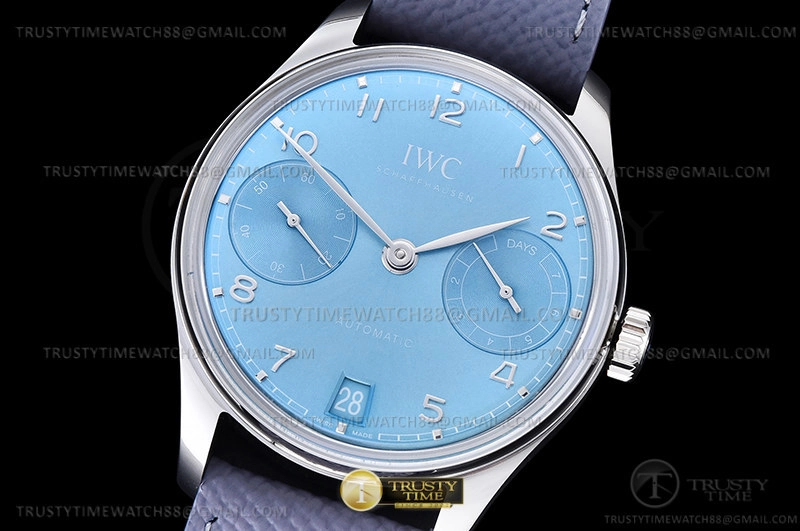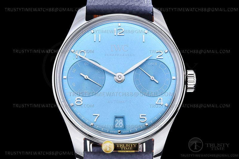 Часы IWC из коллекции Portugieser. Классические мужские часы IWC Portugieser Automatic 7 Days 42mm IW501708 премиального качества (Артикул магазина: IW-0921) оснащены надежным автоматическим механизмом с автоподзаводом (работает от амплитуды движения руки) калибра IWC52010, в котором реализованы следующие функции: часовая, минутная и секундная стрелки, а так же резерв хода, дата. Круглый корпус часов стального цвета, имеющий размер 42 мм и высоту 13 мм превосходно дополнит образ и украсит запястье своего обладателя. Для изготовления часов IWC Portugieser Automatic 7 Days 42mm IW501708 предлагаемых в нашем интернет-магазине, применяются нержавеющая сталь 316L высокого качества (Швейцарский стандарт), а так же сапфировое стекло высокой прочности, благодаря чему обеспечивается максимальная защита от сколов и механических повреждений. Отличительной чертой данной модели является голубой циферблат, часовые индексы которого обеспечивают арабские цифры. Завершает образ кожаный ремешок голубого цвета с фирменной раскладывающейся застежкой IWC. Водонепроницаемость данной модели составляет 30М (WR30) – допускается минимальное воздействие с водой.