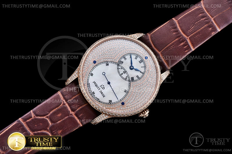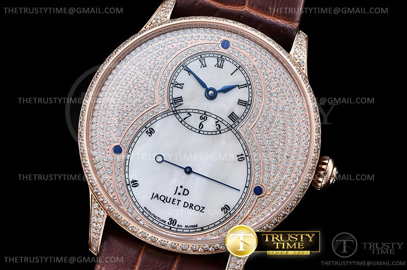 Часы Jaquet Droz из коллекции Grande Secs. Классические мужские часы Jaquet Droz Grande Seconde Diamonds Limited Edition 43mm J003033390 премиального качества (Артикул магазина: JD-0509) оснащены надежным автоматическим механизмом с автоподзаводом (работает от амплитуды движения руки) калибра ST-8003, в котором реализованы следующие функции: часовая, минутная и секундная стрелки, а так же максимально простой функционал без усложнений. Круглый корпус часов розового цвета, имеющий размер 43 мм и высоту 12 мм превосходно дополнит образ и украсит запястье своего обладателя. Для изготовления часов Jaquet Droz Grande Seconde Diamonds Limited Edition 43mm J003033390 предлагаемых в нашем интернет-магазине, применяются нержавеющая сталь 316L высокого качества (Швейцарский стандарт), а так же сапфировое стекло высокой прочности, благодаря чему обеспечивается максимальная защита от сколов и механических повреждений. Отличительной чертой данной модели является перламутровый циферблат, часовые индексы которого обеспечивают римские цифры. Завершает образ кожаный ремешок коричневого цвета с фирменной классической застежкой Jaquet Droz. Водонепроницаемость данной модели составляет 30М (WR30) – допускается минимальное воздействие с водой.