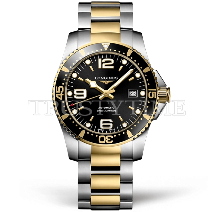 Часы Longines из коллекции HydroConquest. Классические мужские часы Longines Sport Hydroconquest 41mm L3.742.3.56.7 премиального качества (Артикул магазина: LN-0386) оснащены надежным автоматическим механизмом с автоподзаводом (работает от амплитуды движения руки) калибра ETA2824-2, в котором реализованы следующие функции: часовая, минутная и секундная стрелки, а так же дата. Круглый корпус часов комбинированного сталь с желтого золота цвета, имеющий размер 41 мм и высоту 12 мм превосходно дополнит образ и украсит запястье своего обладателя. Для изготовления часов Longines Sport Hydroconquest 41mm L3.742.3.56.7 предлагаемых в нашем интернет-магазине, применяются нержавеющая сталь 316L высокого качества (Швейцарский стандарт), а так же сапфировое стекло высокой прочности, благодаря чему обеспечивается максимальная защита от сколов и механических повреждений. Отличительной чертой данной модели является черный циферблат, часовые индексы которого обеспечивают часовые метки. Завершает образ браслет из нержавеющей стали комбинированного сталь с желтым золотом цвета с фирменной раскладывающейся застежкой Longines. Водонепроницаемость данной модели составляет 30М (WR30) – допускается минимальное воздействие с водой.