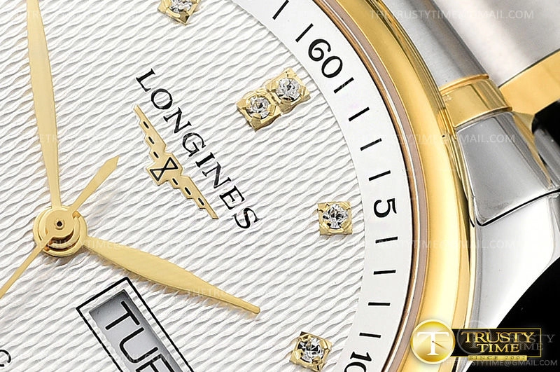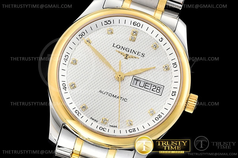 Часы Longines из коллекции Master Collection. Классические мужские часы Longines Master Collection Day Date 38mm L2.755.5.77.7 премиального качества (Артикул магазина: LN-0276) оснащены надежным автоматическим механизмом с автоподзаводом (работает от амплитуды движения руки) калибра ETA2836-2, в котором реализованы следующие функции: часовая, минутная и секундная стрелки, а так же дата, день недели. Круглый корпус часов комбинированного сталь с желтого золота цвета, имеющий размер 38.5 мм и высоту 11 мм превосходно дополнит образ и украсит запястье своего обладателя. Для изготовления часов Longines Master Collection Day Date 38mm L2.755.5.77.7 предлагаемых в нашем интернет-магазине, применяются нержавеющая сталь 316F высокого качества (Швейцарский стандарт), а так же сапфировое стекло высокой прочности, благодаря чему обеспечивается максимальная защита от сколов и механических повреждений. Отличительной чертой данной модели является серебристый циферблат, часовые индексы которого обеспечивают камни. Завершает образ браслет из нержавеющей стали комбинированного сталь с желтым золотом цвета с фирменной раскладывающейся застежкой Longines. Водонепроницаемость данной модели составляет 30М (WR30) – допускается минимальное воздействие с водой.