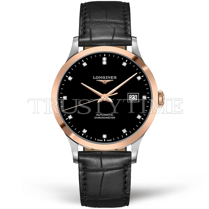 Часы Longines из коллекции Record Collection. Классические мужские часы Longines Tradition Record Collection 40mm L2.821.5.57.2 премиального качества (Артикул магазина: LN-0410) оснащены надежным автоматическим механизмом с автоподзаводом (работает от амплитуды движения руки) калибра L888, в котором реализованы следующие функции: часовая, минутная и секундная стрелки, а так же дата. Круглый корпус часов комбинированного сталь с розового золота цвета, имеющий размер 40 мм и высоту 11.2 мм превосходно дополнит образ и украсит запястье своего обладателя. Для изготовления часов Longines Tradition Record Collection 40mm L2.821.5.57.2 предлагаемых в нашем интернет-магазине, применяются нержавеющая сталь 316F высокого качества (Швейцарский стандарт), а так же сапфировое стекло высокой прочности, благодаря чему обеспечивается максимальная защита от сколов и механических повреждений. Отличительной чертой данной модели является черный циферблат, часовые индексы которого обеспечивают камни. Завершает образ кожаный ремешок черного цвета с фирменной раскладывающейся застежкой Longines. Водонепроницаемость данной модели составляет 30М (WR30) – допускается минимальное воздействие с водой.