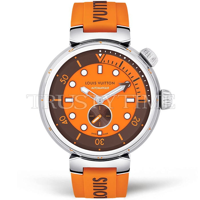 Часы Louis Vuitton из коллекции Tambour Street Diver. Спортивные женские часы Louis Vuitton Tambour Street Diver 44mm QA172A премиального качества (Артикул магазина: LV-02539) оснащены надежным автоматическим механизмом с автоподзаводом (работает от амплитуды движения руки) калибра ETA2892-2, в котором реализованы следующие функции: часовая, минутная и секундная стрелки, а так же максимально простой функционал без усложнений. Круглый корпус часов стального цвета, имеющий размер 44 мм и высоту 12.8 мм превосходно дополнит образ и украсит запястье своего обладателя. Для изготовления часов Louis Vuitton Tambour Street Diver 44mm QA172A предлагаемых в нашем интернет-магазине, применяются нержавеющая сталь 316L высокого качества (Швейцарский стандарт), а так же сапфировое стекло высокой прочности, благодаря чему обеспечивается максимальная защита от сколов и механических повреждений. Отличительной чертой данной модели является оранжевый циферблат, часовые индексы которого обеспечивают часовые метки. Завершает образ каучуковый ремешок оранжевого цвета с фирменной классической застежкой Louis Vuitton. Водонепроницаемость данной модели составляет 30М (WR30) – допускается минимальное воздействие с водой.