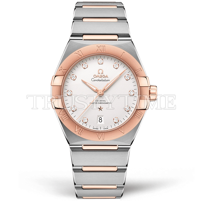 Часы Omega из коллекции Constellation. Классические мужские часы Omega Constellation Co-axial Master Chronometer 39mm 31.20.39.20.52.001 премиального качества (Артикул магазина: OM-0901) оснащены надежным автоматическим механизмом с автоподзаводом (работает от амплитуды движения руки) калибра 8800, в котором реализованы следующие функции: часовая, минутная и секундная стрелки, а так же дата. Круглый корпус часов комбинированного сталь с розового золота цвета, имеющий размер 39 мм и высоту 12.4 мм превосходно дополнит образ и украсит запястье своего обладателя. Для изготовления часов Omega Constellation Co-axial Master Chronometer 39mm 31.20.39.20.52.001 предлагаемых в нашем интернет-магазине, применяются нержавеющая сталь 316F высокого качества (Швейцарский стандарт), а так же сапфировое стекло высокой прочности, благодаря чему обеспечивается максимальная защита от сколов и механических повреждений. Отличительной чертой данной модели является белый циферблат, часовые индексы которого обеспечивают камни. Завершает образ браслет из нержавеющей стали комбинированного сталь с розовым золотом цвета с фирменной раскладывающейся застежкой Omega. Водонепроницаемость данной модели составляет 30М (WR30) – допускается минимальное воздействие с водой.