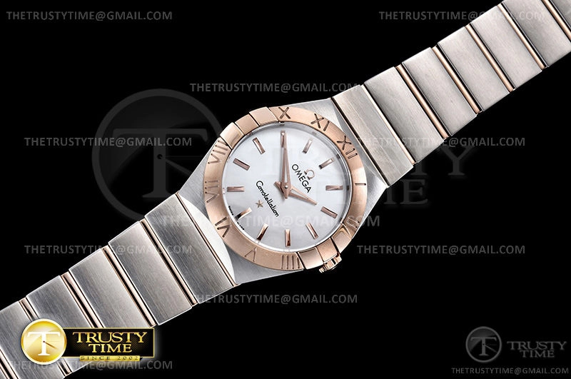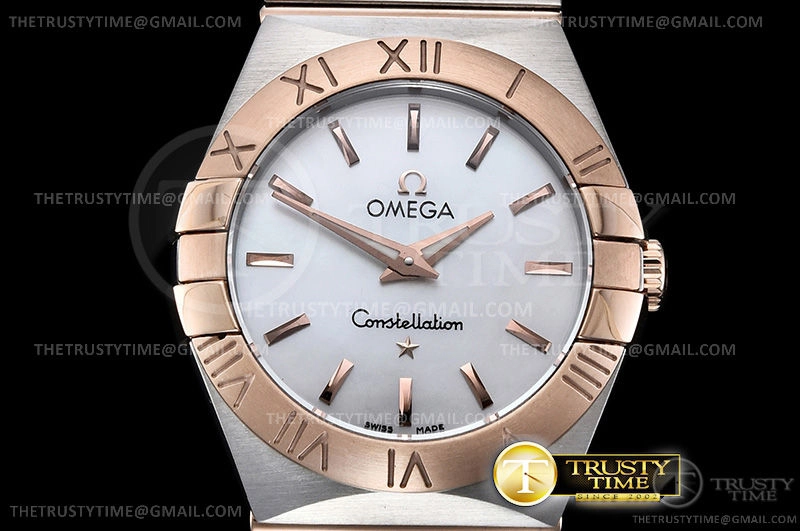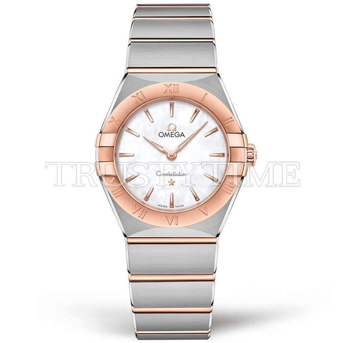 Часы Omega из коллекции Constellation. Классические женские часы Omega Constellation Quartz 28mm 131.20.28.60.05.001 премиального качества (Артикул магазина: OM-0456) оснащены надежным кварцевым механизмом (работает от батареи) калибра Swiss Quartz ETA, в котором реализованы следующие функции: часова и минутка стрелки, а так же максимально простой функционал без усложнений. Круглый корпус часов комбинированного сталь с розового золота цвета, имеющий размер 28 мм и высоту 9 мм превосходно дополнит образ и украсит запястье своего обладателя. Для изготовления часов Omega Constellation Quartz 28mm 131.20.28.60.05.001 предлагаемых в нашем интернет-магазине, применяются нержавеющая сталь 316F высокого качества (Швейцарский стандарт), а так же сапфировое стекло высокой прочности, благодаря чему обеспечивается максимальная защита от сколов и механических повреждений. Отличительной чертой данной модели является перламутровый циферблат, часовые индексы которого обеспечивают часовые метки. Завершает образ браслет из нержавеющей стали комбинированного сталь с розовым золотом цвета с фирменной раскладывающейся застежкой Omega. Водонепроницаемость данной модели составляет 30М (WR30) – допускается минимальное воздействие с водой.