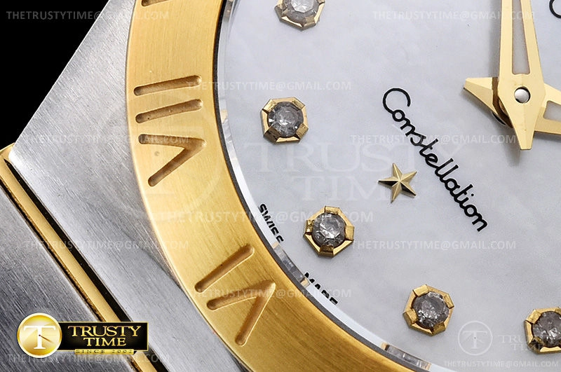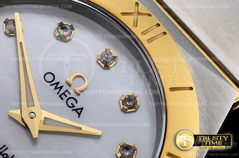 Часы Omega из коллекции Constellation. Классические женские часы Omega Constellation Manhattan Quartz 28mm 131.20.28.60.55.002 премиального качества (Артикул магазина: OM-0461) оснащены надежным кварцевым механизмом (работает от батареи) калибра Swiss Quartz ETA, в котором реализованы следующие функции: часова и минутка стрелки, а так же максимально простой функционал без усложнений. Круглый корпус часов комбинированного сталь с желтого золота цвета, имеющий размер 28 мм и высоту 9 мм превосходно дополнит образ и украсит запястье своего обладателя. Для изготовления часов Omega Constellation Manhattan Quartz 28mm 131.20.28.60.55.002 предлагаемых в нашем интернет-магазине, применяются нержавеющая сталь 316F высокого качества (Швейцарский стандарт), а так же сапфировое стекло высокой прочности, благодаря чему обеспечивается максимальная защита от сколов и механических повреждений. Отличительной чертой данной модели является перламутровый циферблат, часовые индексы которого обеспечивают камни. Завершает образ браслет из нержавеющей стали комбинированного сталь с желтым золотом цвета с фирменной раскладывающейся застежкой Omega. Водонепроницаемость данной модели составляет 30М (WR30) – допускается минимальное воздействие с водой.