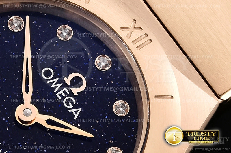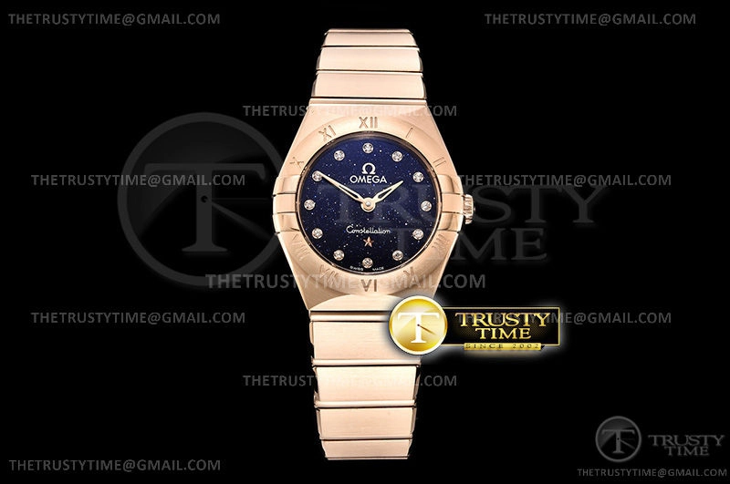 Часы Omega из коллекции Constellation. Классические женские часы Omega Constellation Quartz 25mm 131.50.25.60.53.002 премиального качества (Артикул магазина: OM-0443) оснащены надежным кварцевым механизмом (работает от батареи) калибра Swiss Quartz ETA, в котором реализованы следующие функции: часова и минутка стрелки, а так же максимально простой функционал без усложнений. Круглый корпус часов розового цвета, имеющий размер 25 мм и высоту 8 мм превосходно дополнит образ и украсит запястье своего обладателя. Для изготовления часов Omega Constellation Quartz 25mm 131.50.25.60.53.002 предлагаемых в нашем интернет-магазине, применяются нержавеющая сталь 316F высокого качества (Швейцарский стандарт), а так же сапфировое стекло высокой прочности, благодаря чему обеспечивается максимальная защита от сколов и механических повреждений. Отличительной чертой данной модели является синий циферблат, часовые индексы которого обеспечивают камни. Завершает образ браслет из нержавеющей стали цвета розового золота с фирменной раскладывающейся застежкой Omega. Водонепроницаемость данной модели составляет 30М (WR30) – допускается минимальное воздействие с водой.