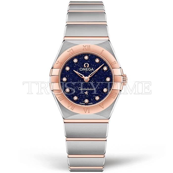 Часы Omega из коллекции Constellation. Классические женские часы Omega Constellation Quartz 25mm 131.20.25.60.53.002 премиального качества (Артикул магазина: OM-0439) оснащены надежным кварцевым механизмом (работает от батареи) калибра Swiss Quartz ETA, в котором реализованы следующие функции: часова и минутка стрелки, а так же максимально простой функционал без усложнений. Круглый корпус часов комбинированного сталь с розового золота цвета, имеющий размер 25 мм и высоту 8 мм превосходно дополнит образ и украсит запястье своего обладателя. Для изготовления часов Omega Constellation Quartz 25mm 131.20.25.60.53.002 предлагаемых в нашем интернет-магазине, применяются нержавеющая сталь 316F высокого качества (Швейцарский стандарт), а так же сапфировое стекло высокой прочности, благодаря чему обеспечивается максимальная защита от сколов и механических повреждений. Отличительной чертой данной модели является синий циферблат, часовые индексы которого обеспечивают камни. Завершает образ браслет из нержавеющей стали комбинированного сталь с розовым золотом цвета с фирменной раскладывающейся застежкой Omega. Водонепроницаемость данной модели составляет 30М (WR30) – допускается минимальное воздействие с водой.