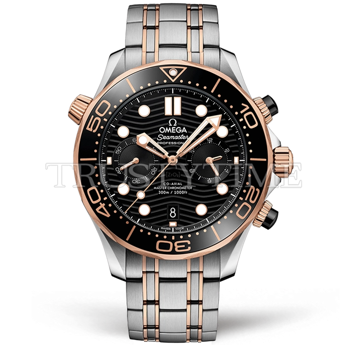 Часы Omega из коллекции Seamaster Chronograph. Спортивные мужские часы Omega Seamaster Diver 300m Co‑Axial Master Chronometer Chronograph 44mm 210.20.44.51.01.001 премиального качества (Артикул магазина: OM-0926) оснащены надежным автоматическим механизмом с автоподзаводом (работает от амплитуды движения руки) калибра 9900, в котором реализованы следующие функции: часовая, минутная и секундная стрелки, а так же хронограф, дата. Круглый корпус часов комбинированного сталь с розового золота цвета, имеющий размер 44 мм и высоту 17 мм превосходно дополнит образ и украсит запястье своего обладателя. Для изготовления часов Omega Seamaster Diver 300m Co‑Axial Master Chronometer Chronograph 44mm 210.20.44.51.01.001 предлагаемых в нашем интернет-магазине, применяются нержавеющая сталь 316F высокого качества (Швейцарский стандарт), а так же сапфировое стекло высокой прочности, благодаря чему обеспечивается максимальная защита от сколов и механических повреждений. Отличительной чертой данной модели является черный циферблат, часовые индексы которого обеспечивают часовые метки. Завершает образ браслет из нержавеющей стали комбинированного сталь с розовым золотом цвета с фирменной раскладывающейся застежкой Omega. Водонепроницаемость данной модели составляет 30М (WR30) – допускается минимальное воздействие с водой.