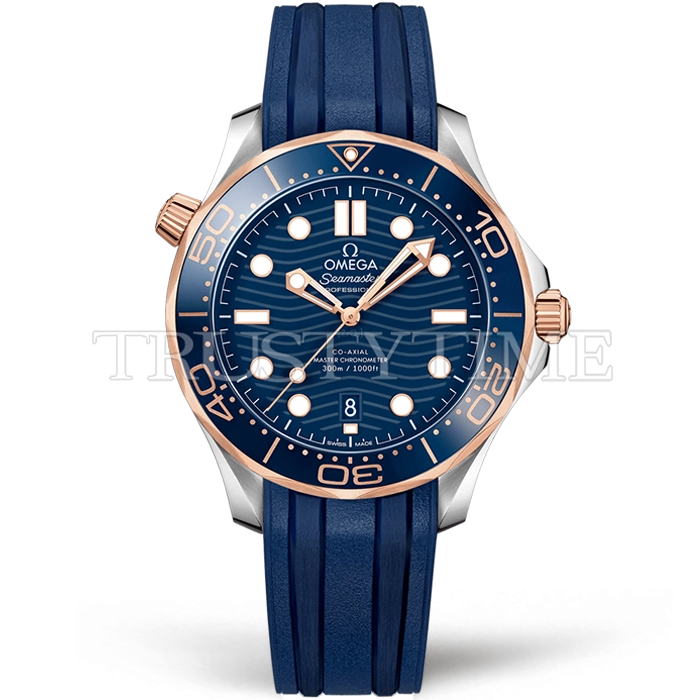 Часы Omega из коллекции Seamaster Diver. Классические мужские часы Omega Seamaster Diver 300m Co-axial Chronometer 42mm 210.22.42.20.03.002 премиального качества (Артикул магазина: OM-0954) оснащены надежным автоматическим механизмом с автоподзаводом (работает от амплитуды движения руки) калибра 8801, в котором реализованы следующие функции: часовая, минутная и секундная стрелки, а так же дата. Круглый корпус часов комбинированного сталь с розового золота цвета, имеющий размер 42 мм и высоту 13 мм превосходно дополнит образ и украсит запястье своего обладателя. Для изготовления часов Omega Seamaster Diver 300m Co-axial Chronometer 42mm 210.22.42.20.03.002 предлагаемых в нашем интернет-магазине, применяются нержавеющая сталь 316F высокого качества (Швейцарский стандарт), а так же сапфировое стекло высокой прочности, благодаря чему обеспечивается максимальная защита от сколов и механических повреждений. Отличительной чертой данной модели является синий циферблат, часовые индексы которого обеспечивают часовые метки. Завершает образ каучуковый ремешок синего цвета с фирменной классической застежкой Omega. Водонепроницаемость данной модели составляет 30М (WR30) – допускается минимальное воздействие с водой.