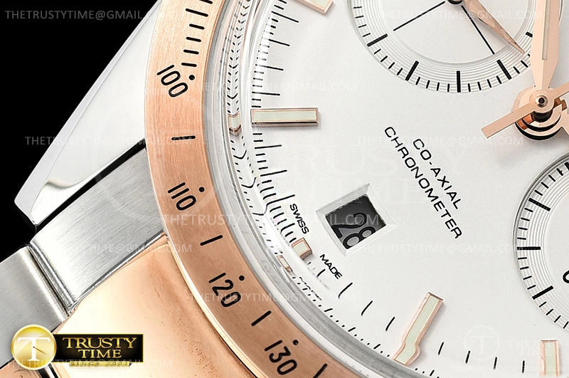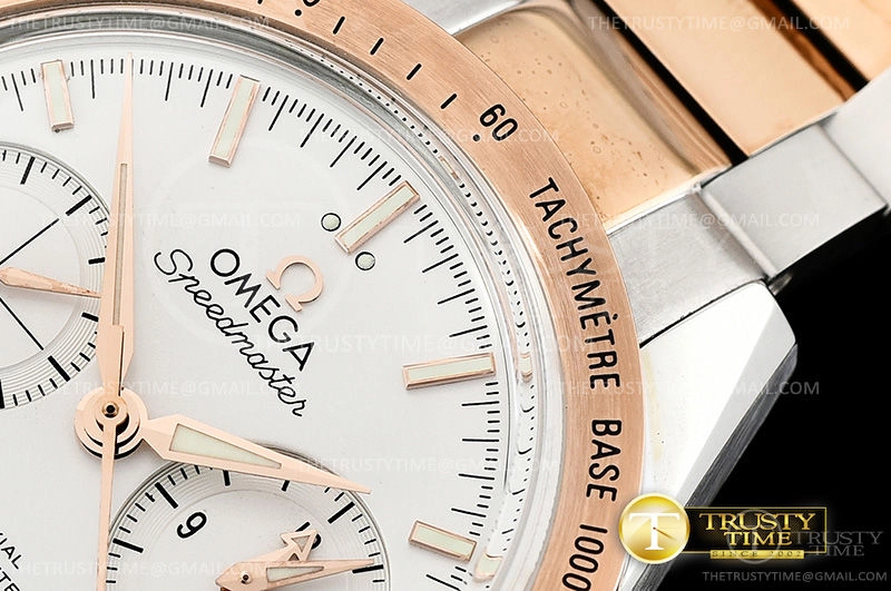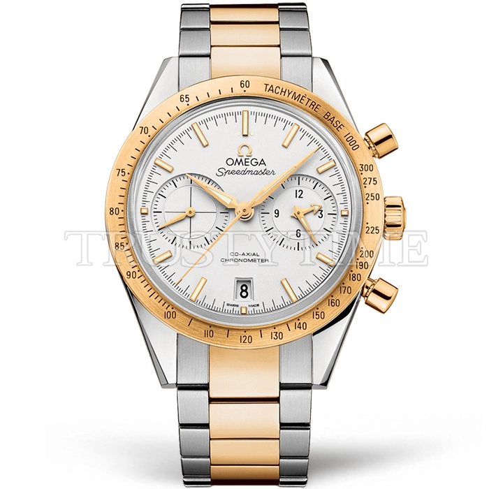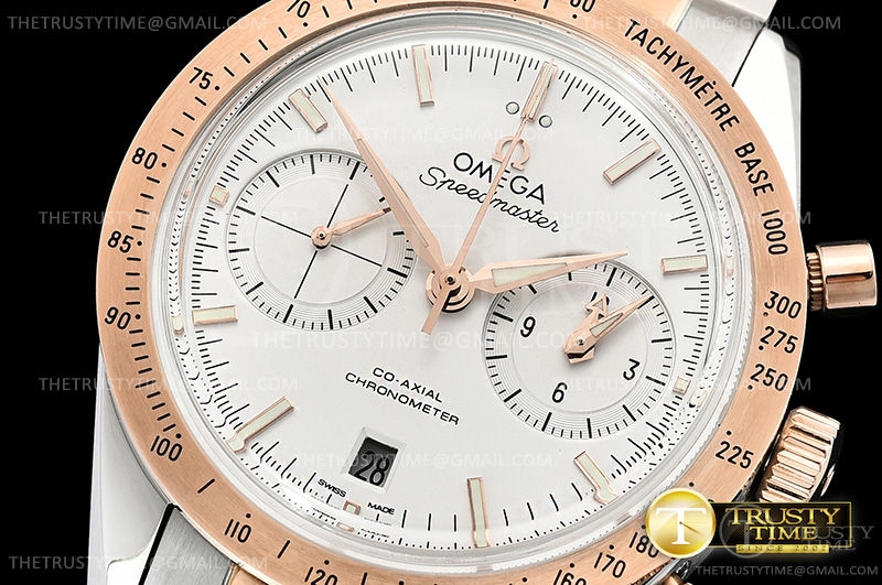 Часы Omega из коллекции SpeedMaster. Спортивные мужские часы Omega Speedmaster Speedmaster 57 Co-Axial Chronograph 41.5mm 331.20.42.51.02.001 премиального качества (Артикул магазина: OM-0734) оснащены надежным автоматическим механизмом с автоподзаводом (работает от амплитуды движения руки) калибра 9300, в котором реализованы следующие функции: часовая, минутная и секундная стрелки, а так же хронограф, дата. Круглый корпус часов комбинированного сталь с розового золота цвета, имеющий размер 41.5 мм и высоту 18.5 мм превосходно дополнит образ и украсит запястье своего обладателя. Для изготовления часов Omega Speedmaster Speedmaster 57 Co-Axial Chronograph 41.5mm 331.20.42.51.02.001 предлагаемых в нашем интернет-магазине, применяются нержавеющая сталь 316F высокого качества (Швейцарский стандарт), а так же сапфировое стекло высокой прочности, благодаря чему обеспечивается максимальная защита от сколов и механических повреждений. Отличительной чертой данной модели является белый циферблат, часовые индексы которого обеспечивают часовые метки. Завершает образ браслет из нержавеющей стали комбинированного сталь с розовым золотом цвета с фирменной раскладывающейся застежкой Omega. Водонепроницаемость данной модели составляет 30М (WR30) – допускается минимальное воздействие с водой.
