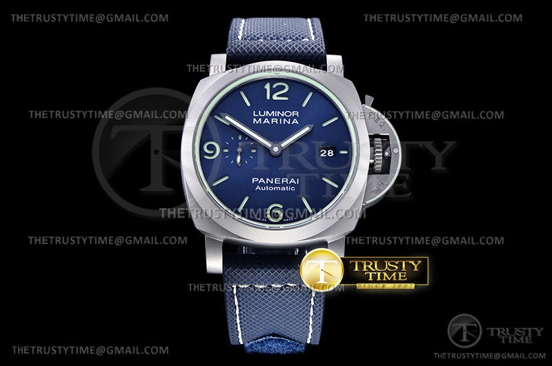 Часы Panerai из коллекции Luminor Marina. Классические мужские часы Panerai Luminor 1950 3 Days Titanium 44mm PAM01117 премиального качества (Артикул магазина: PN-0792) оснащены надежным автоматическим механизмом с автоподзаводом (работает от амплитуды движения руки) калибра P9010, в котором реализованы следующие функции: часовая, минутная и секундная стрелки, а так же дата. Круглый корпус часов серого цвета, имеющий размер 44 мм и высоту 14.5 мм превосходно дополнит образ и украсит запястье своего обладателя. Для изготовления часов Panerai Luminor 1950 3 Days Titanium 44mm PAM01117 предлагаемых в нашем интернет-магазине, применяются титан высокого качества (Швейцарский стандарт), а так же сапфировое стекло высокой прочности, благодаря чему обеспечивается максимальная защита от сколов и механических повреждений. Отличительной чертой данной модели является синий циферблат, часовые индексы которого обеспечивают часовые метки. Завершает образ нейлоновый ремешок синего цвета на липучке Panerai. Водонепроницаемость данной модели составляет 30М (WR30) – допускается минимальное воздействие с водой.
