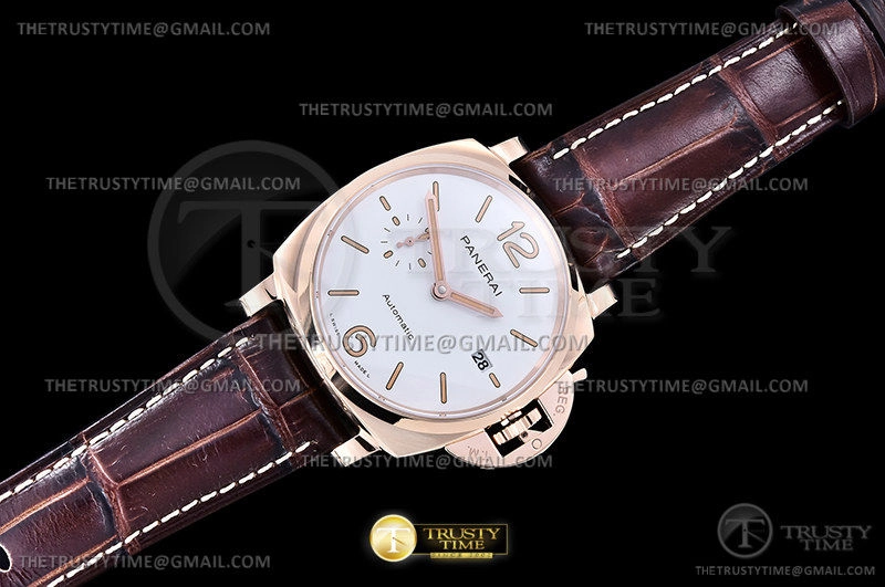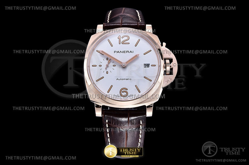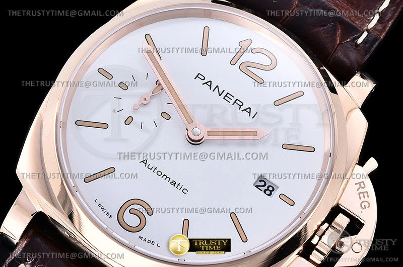 Часы Panerai из коллекции Luminor. Классические мужские часы Panerai Luminor Due Automatic Goldtech 42mm PAM01042 премиального качества (Артикул магазина: PN-0807) оснащены надежным автоматическим механизмом с автоподзаводом (работает от амплитуды движения руки) калибра P900, в котором реализованы следующие функции: часовая, минутная и секундная стрелки, а так же дата. Круглый корпус часов розового цвета, имеющий размер 42 мм и высоту 14 мм превосходно дополнит образ и украсит запястье своего обладателя. Для изготовления часов Panerai Luminor Due Automatic Goldtech 42mm PAM01042 предлагаемых в нашем интернет-магазине, применяются нержавеющая сталь 316F высокого качества (Швейцарский стандарт), а так же сапфировое стекло высокой прочности, благодаря чему обеспечивается максимальная защита от сколов и механических повреждений. Отличительной чертой данной модели является белый циферблат, часовые индексы которого обеспечивают часовые метки. Завершает образ кожаный ремешок коричневого цвета с фирменной классической застежкой Panerai. Водонепроницаемость данной модели составляет 30М (WR30) – допускается минимальное воздействие с водой.