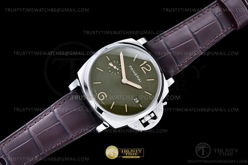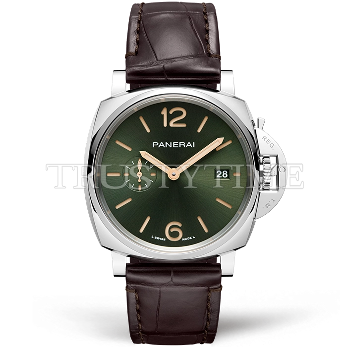 Часы Panerai из коллекции Luminor. Классические мужские часы Panerai Luminor Due Platinumtech™ 42mm PAM01329 премиального качества (Артикул магазина: PN-0884) оснащены надежным автоматическим механизмом с автоподзаводом (работает от амплитуды движения руки) калибра P900, в котором реализованы следующие функции: часовая, минутная и секундная стрелки, а так же дата. Круглый корпус часов стального цвета, имеющий размер 42 мм и высоту 14 мм превосходно дополнит образ и украсит запястье своего обладателя. Для изготовления часов Panerai Luminor Due Platinumtech™ 42mm PAM01329 предлагаемых в нашем интернет-магазине, применяются нержавеющая сталь 316F высокого качества (Швейцарский стандарт), а так же сапфировое стекло высокой прочности, благодаря чему обеспечивается максимальная защита от сколов и механических повреждений. Отличительной чертой данной модели является зеленый циферблат, часовые индексы которого обеспечивают часовые метки. Завершает образ кожаный ремешок коричневого цвета с фирменной классической застежкой Panerai. Водонепроницаемость данной модели составляет 30М (WR30) – допускается минимальное воздействие с водой.