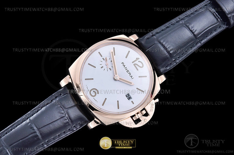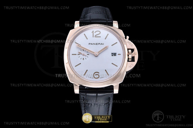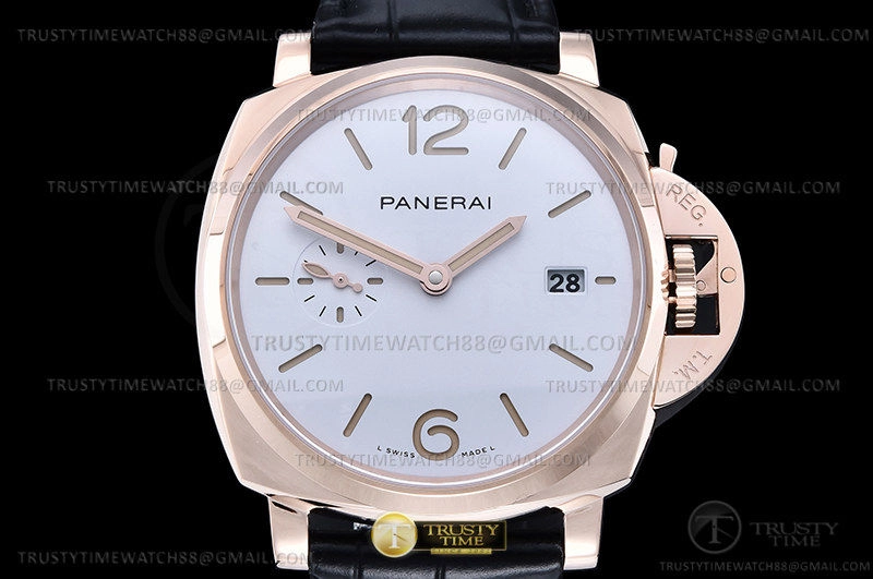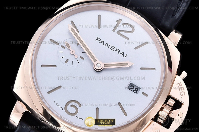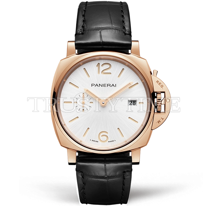 Часы Panerai из коллекции Luminor. Классические мужские часы Panerai Luminor Due Goldtech™ 42mm PAM01336 премиального качества (Артикул магазина: PN-0881) оснащены надежным автоматическим механизмом с автоподзаводом (работает от амплитуды движения руки) калибра P900, в котором реализованы следующие функции: часовая, минутная и секундная стрелки, а так же дата. Круглый корпус часов розового цвета, имеющий размер 42 мм и высоту 14 мм превосходно дополнит образ и украсит запястье своего обладателя. Для изготовления часов Panerai Luminor Due Goldtech™ 42mm PAM01336 предлагаемых в нашем интернет-магазине, применяются нержавеющая сталь 316F высокого качества (Швейцарский стандарт), а так же сапфировое стекло высокой прочности, благодаря чему обеспечивается максимальная защита от сколов и механических повреждений. Отличительной чертой данной модели является белый циферблат, часовые индексы которого обеспечивают часовые метки. Завершает образ кожаный ремешок черного цвета с фирменной классической застежкой Panerai. Водонепроницаемость данной модели составляет 30М (WR30) – допускается минимальное воздействие с водой.