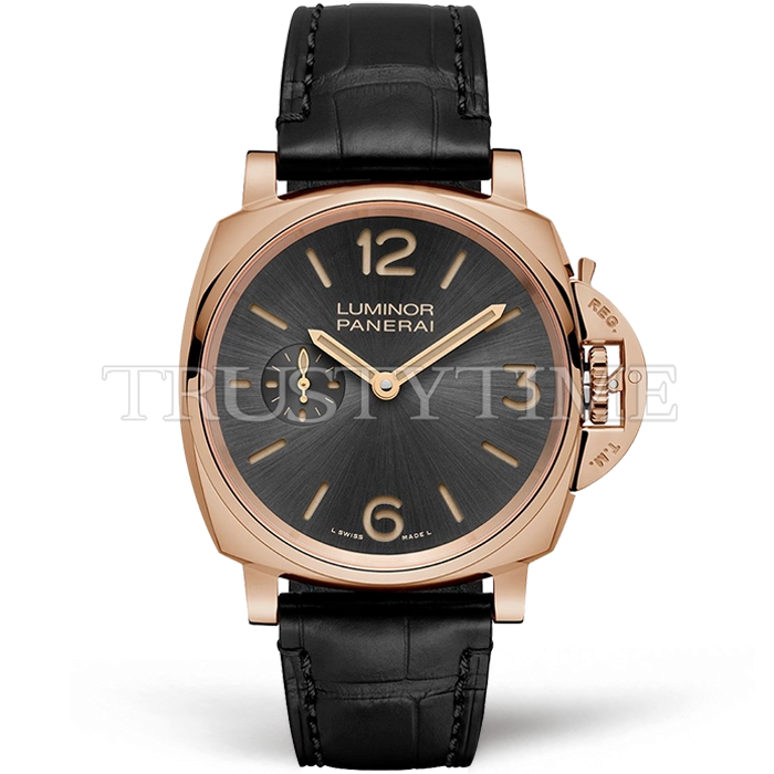 Часы Panerai из коллекции Luminor. Классические мужские часы Panerai Luminor Due 3 Days 42mm PAM00677 премиального качества (Артикул магазина: PN-0704) оснащены надежным автоматическим механизмом с автоподзаводом (работает от амплитуды движения руки) калибра P1000, в котором реализованы следующие функции: часовая, минутная и секундная стрелки, а так же максимально простой функционал без усложнений. Круглый корпус часов розового цвета, имеющий размер 42 мм и высоту 14 мм превосходно дополнит образ и украсит запястье своего обладателя. Для изготовления часов Panerai Luminor Due 3 Days 42mm PAM00677 предлагаемых в нашем интернет-магазине, применяются нержавеющая сталь 316F высокого качества (Швейцарский стандарт), а так же сапфировое стекло высокой прочности, благодаря чему обеспечивается максимальная защита от сколов и механических повреждений. Отличительной чертой данной модели является серый циферблат, часовые индексы которого обеспечивают часовые метки. Завершает образ кожаный ремешок черного цвета с фирменной классической застежкой Panerai. Водонепроницаемость данной модели составляет 30М (WR30) – допускается минимальное воздействие с водой.