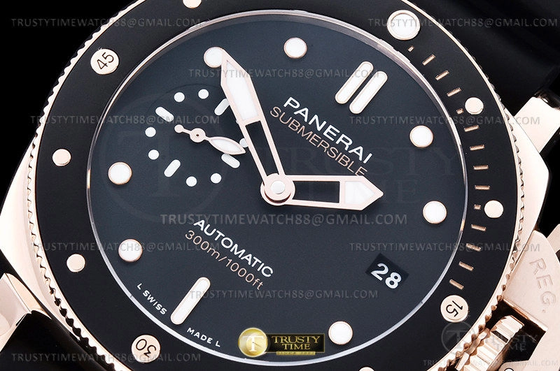 Часы Panerai из коллекции Submersible. Классические мужские часы Panerai Submersible Goldtech™ 42mm PAM02164 премиального качества (Артикул магазина: PN-0882) оснащены надежным автоматическим механизмом с автоподзаводом (работает от амплитуды движения руки) калибра P900, в котором реализованы следующие функции: часовая, минутная и секундная стрелки, а так же дата. Круглый корпус часов розового цвета, имеющий размер 42 мм и высоту 14.5 мм превосходно дополнит образ и украсит запястье своего обладателя. Для изготовления часов Panerai Submersible Goldtech™ 42mm PAM02164 предлагаемых в нашем интернет-магазине, применяются нержавеющая сталь 316F высокого качества (Швейцарский стандарт), а так же сапфировое стекло высокой прочности, благодаря чему обеспечивается максимальная защита от сколов и механических повреждений. Отличительной чертой данной модели является черный циферблат, часовые индексы которого обеспечивают часовые метки. Завершает образ каучуковый ремешок черного цвета с фирменной классической застежкой Panerai. Водонепроницаемость данной модели составляет 30М (WR30) – допускается минимальное воздействие с водой.