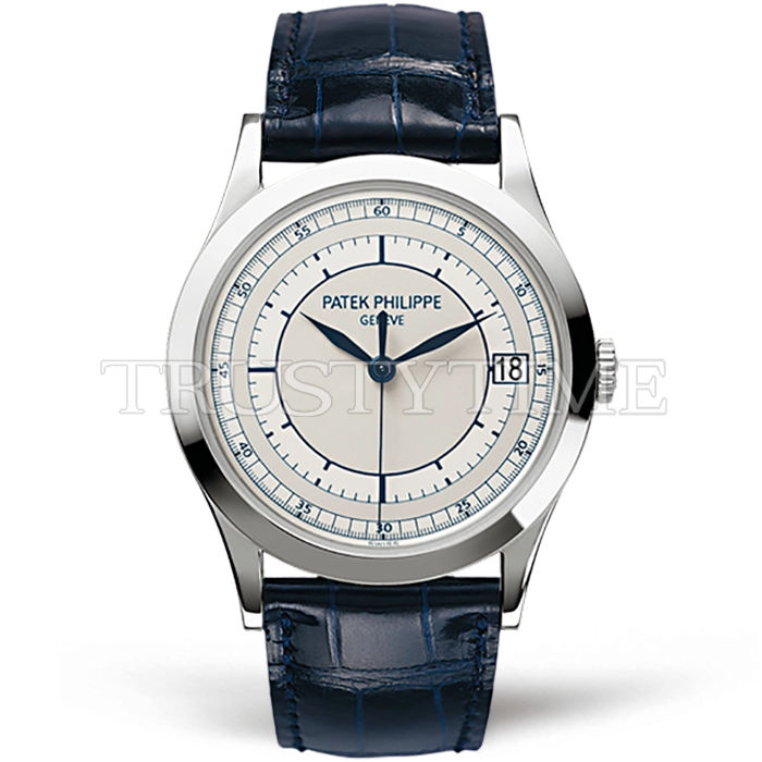 Часы Patek Philippe из коллекции Calatrava. Классические мужские часы Patek Philippe Calatrava Scientific 38mm 5296G-001 премиального качества (Артикул магазина: PP-0400) оснащены надежным автоматическим механизмом с автоподзаводом (работает от амплитуды движения руки) калибра PP324CS, в котором реализованы следующие функции: часовая, минутная и секундная стрелки, а так же дата. Круглый корпус часов стального цвета, имеющий размер 38 мм и высоту 9 мм превосходно дополнит образ и украсит запястье своего обладателя. Для изготовления часов Patek Philippe Calatrava Scientific 38mm 5296G-001 предлагаемых в нашем интернет-магазине, применяются нержавеющая сталь 316F высокого качества (Швейцарский стандарт), а так же сапфировое стекло высокой прочности, благодаря чему обеспечивается максимальная защита от сколов и механических повреждений. Отличительной чертой данной модели является серебристый циферблат, часовые индексы которого обеспечивают часовые метки. Завершает образ кожаный ремешок синего цвета с фирменной классической застежкой Patek Philippe. Водонепроницаемость данной модели составляет 30М (WR30) – допускается минимальное воздействие с водой.