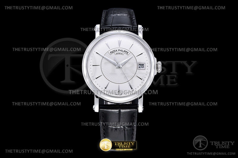 Часы Patek Philippe из коллекции Calatrava. Классические мужские часы Patek Philippe Calatrava 38mm 5153G-010 премиального качества (Артикул магазина: PP-0682) оснащены надежным автоматическим механизмом с автоподзаводом (работает от амплитуды движения руки) калибра PP324SC, в котором реализованы следующие функции: часовая, минутная и секундная стрелки, а так же дата. Круглый корпус часов стального цвета, имеющий размер 38 мм и высоту 11 мм превосходно дополнит образ и украсит запястье своего обладателя. Для изготовления часов Patek Philippe Calatrava 38mm 5153G-010 предлагаемых в нашем интернет-магазине, применяются нержавеющая сталь 316F высокого качества (Швейцарский стандарт), а так же сапфировое стекло высокой прочности, благодаря чему обеспечивается максимальная защита от сколов и механических повреждений. Отличительной чертой данной модели является белый циферблат, часовые индексы которого обеспечивают часовые метки. Завершает образ кожаный ремешок черного цвета с фирменной раскладывающейся застежкой Patek Philippe. Водонепроницаемость данной модели составляет 30М (WR30) – допускается минимальное воздействие с водой.