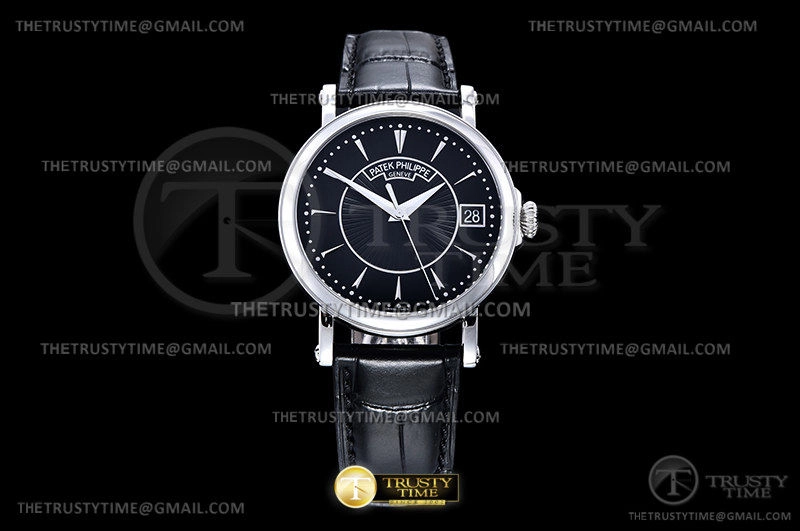 Часы Patek Philippe из коллекции Calatrava. Классические мужские часы Patek Philippe Calatrava 38mm 5153G-001 премиального качества (Артикул магазина: PP-0685) оснащены надежным автоматическим механизмом с автоподзаводом (работает от амплитуды движения руки) калибра PP324SC, в котором реализованы следующие функции: часовая, минутная и секундная стрелки, а так же дата. Круглый корпус часов стального цвета, имеющий размер 38 мм и высоту 11 мм превосходно дополнит образ и украсит запястье своего обладателя. Для изготовления часов Patek Philippe Calatrava 38mm 5153G-001 предлагаемых в нашем интернет-магазине, применяются нержавеющая сталь 316F высокого качества (Швейцарский стандарт), а так же сапфировое стекло высокой прочности, благодаря чему обеспечивается максимальная защита от сколов и механических повреждений. Отличительной чертой данной модели является черный циферблат, часовые индексы которого обеспечивают часовые метки. Завершает образ кожаный ремешок черного цвета с фирменной раскладывающейся застежкой Patek Philippe. Водонепроницаемость данной модели составляет 30М (WR30) – допускается минимальное воздействие с водой.