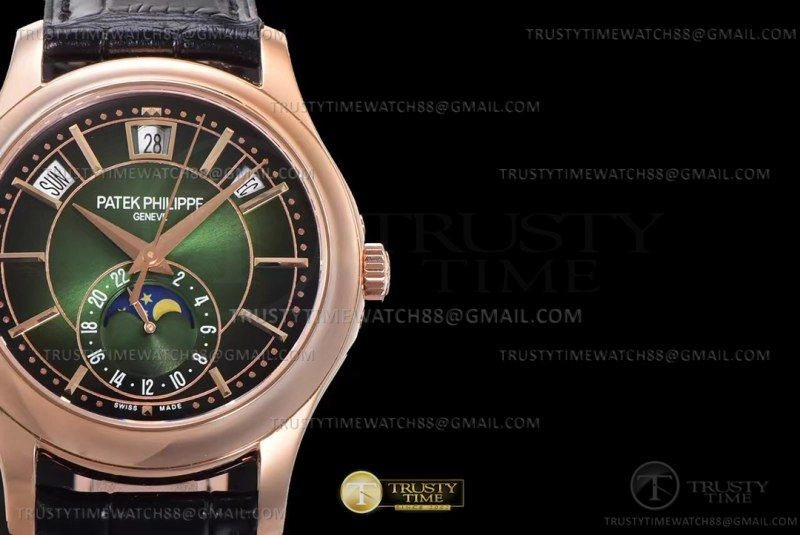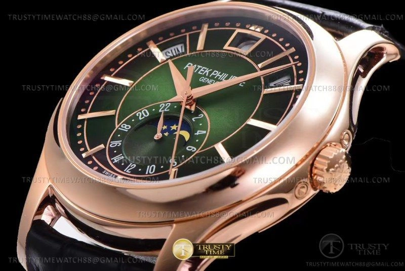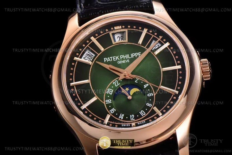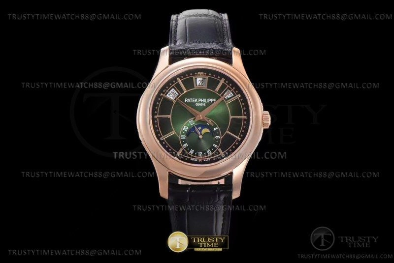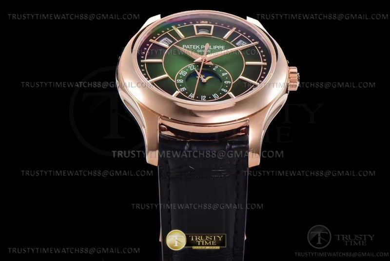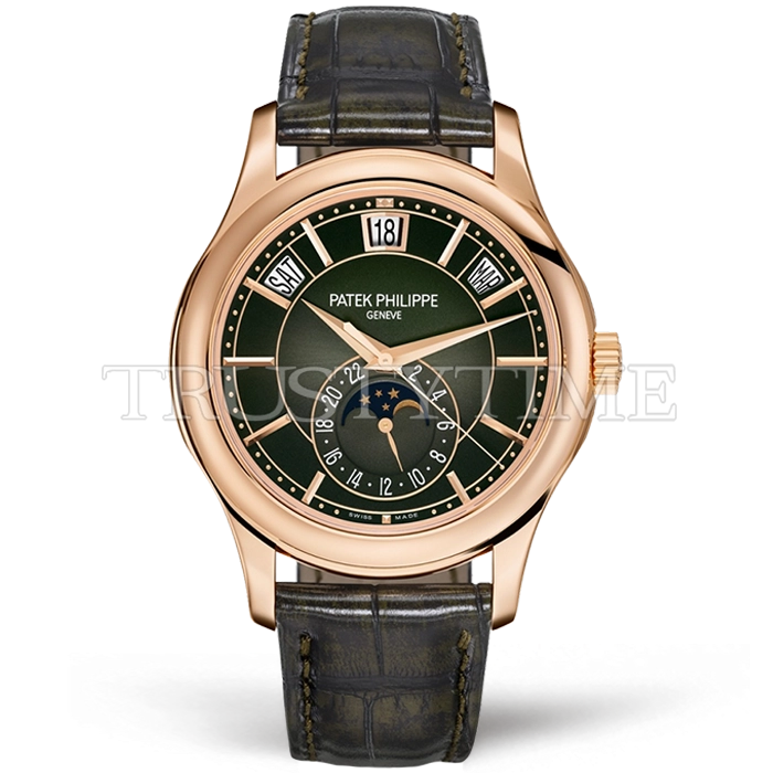 Часы Patek Philippe из коллекции Complications Annual Calendar. Классические мужские часы Patek Philippe Complications Annual Calendar 40mm 5205R-011 премиального качества (Артикул магазина: PP-0749) оснащены надежным автоматическим механизмом с автоподзаводом (работает от амплитуды движения руки) калибра PP324, в котором реализованы следующие функции: часовая, минутная и секундная стрелки, а так же дата, день недели, день-ночь, месяц. Круглый корпус часов розового цвета, имеющий размер 40 мм и высоту 13 мм превосходно дополнит образ и украсит запястье своего обладателя. Для изготовления часов Patek Philippe Complications Annual Calendar 40mm 5205R-011 предлагаемых в нашем интернет-магазине, применяются нержавеющая сталь 316L высокого качества (Швейцарский стандарт), а так же сапфировое стекло высокой прочности, благодаря чему обеспечивается максимальная защита от сколов и механических повреждений. Отличительной чертой данной модели является зеленый циферблат, часовые индексы которого обеспечивают часовые метки. Завершает образ кожаный ремешок черного цвета с фирменной классической застежкой Patek Philippe. Водонепроницаемость данной модели составляет 30М (WR30) – допускается минимальное воздействие с водой.