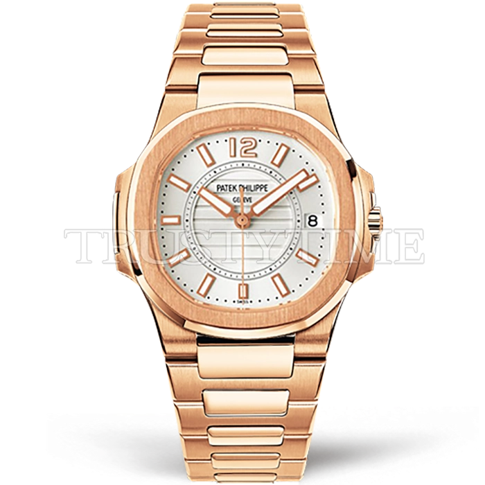 Часы Patek Philippe из коллекции Nautilus. Классические женские часы Patek Philippe Nautilus Ladies 32mm 7011/1R-001 премиального качества (Артикул магазина: PP-0773) оснащены надежным кварцевым механизмом (работает от батареи) калибра Swiss Quartz ETA, в котором реализованы следующие функции: часовая, минутная и секундная стрелки, а так же дата. Восьмиугольный корпус часов розового цвета, имеющий размер 32 мм и высоту 7 мм превосходно дополнит образ и украсит запястье своего обладателя. Для изготовления часов Patek Philippe Nautilus Ladies 32mm 7011/1R-001 предлагаемых в нашем интернет-магазине, применяются нержавеющая сталь 316L высокого качества (Швейцарский стандарт), а так же сапфировое стекло высокой прочности, благодаря чему обеспечивается максимальная защита от сколов и механических повреждений. Отличительной чертой данной модели является белый циферблат, часовые индексы которого обеспечивают часовые метки. Завершает образ браслет из нержавеющей стали цвета розового золота с фирменной раскладывающейся застежкой Patek Philippe. Водонепроницаемость данной модели составляет 30М (WR30) – допускается минимальное воздействие с водой.