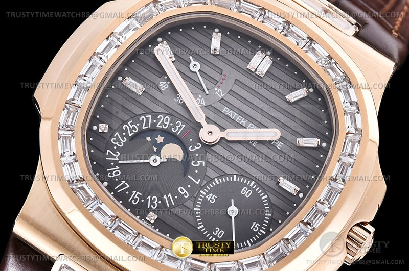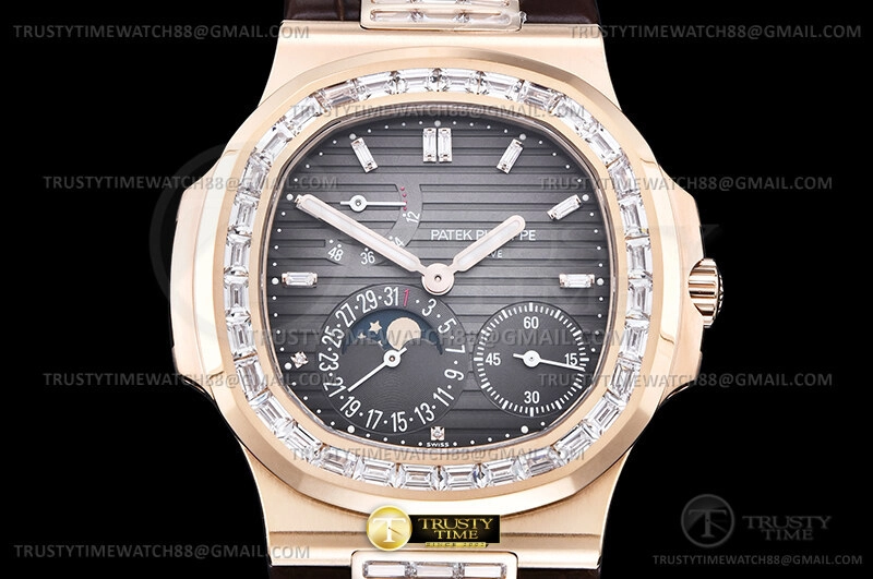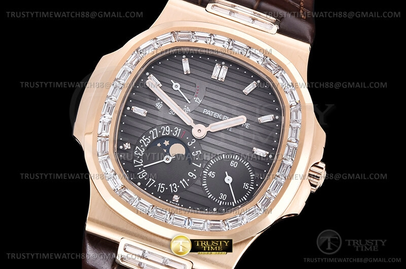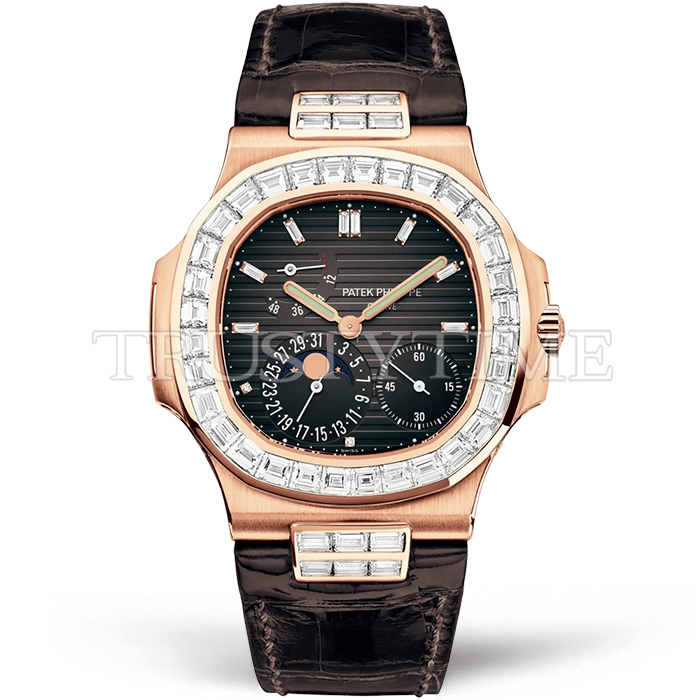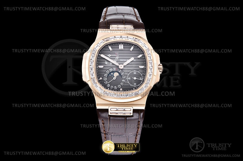 Часы Patek Philippe из коллекции Nautilus Power Reserve. Классические мужские часы Patek Philippe Nautilus Power Reserve Moonphase 40mm 5724R-001 премиального качества (Артикул магазина: PP-0782) оснащены надежным автоматическим механизмом с автоподзаводом (работает от амплитуды движения руки) калибра PP240, в котором реализованы следующие функции: часовая, минутная и секундная стрелки, а так же дата, фаза луны, резерв хода. Восьмиугольный корпус часов розового цвета, имеющий размер 40 мм и высоту 10.5 мм превосходно дополнит образ и украсит запястье своего обладателя. Для изготовления часов Patek Philippe Nautilus Power Reserve Moonphase 40mm 5724R-001 предлагаемых в нашем интернет-магазине, применяются нержавеющая сталь 316L высокого качества (Швейцарский стандарт), а так же сапфировое стекло высокой прочности, благодаря чему обеспечивается максимальная защита от сколов и механических повреждений. Отличительной чертой данной модели является серый циферблат, часовые индексы которого обеспечивают часовые метки. Завершает образ кожаный ремешок коричневого цвета с фирменной раскладывающейся застежкой Patek Philippe. Водонепроницаемость данной модели составляет 30М (WR30) – допускается минимальное воздействие с водой.